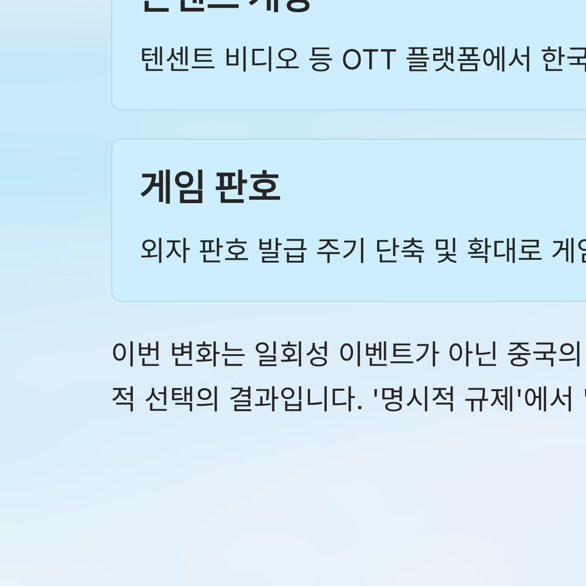A: 최근 중국의 한국인 대상 비자 면제 조치와 한국 게임에 대한 외자 판호 발급 재개는 단순한 구두 약속을 넘어선 실질적인 개방 신호로 해석됩니다. 과거와 달리 민간 교류와 실무적 규제 완화가 동시에 진행되고 있어 정책의 연속성이 높을 것으로 기대됩니다.