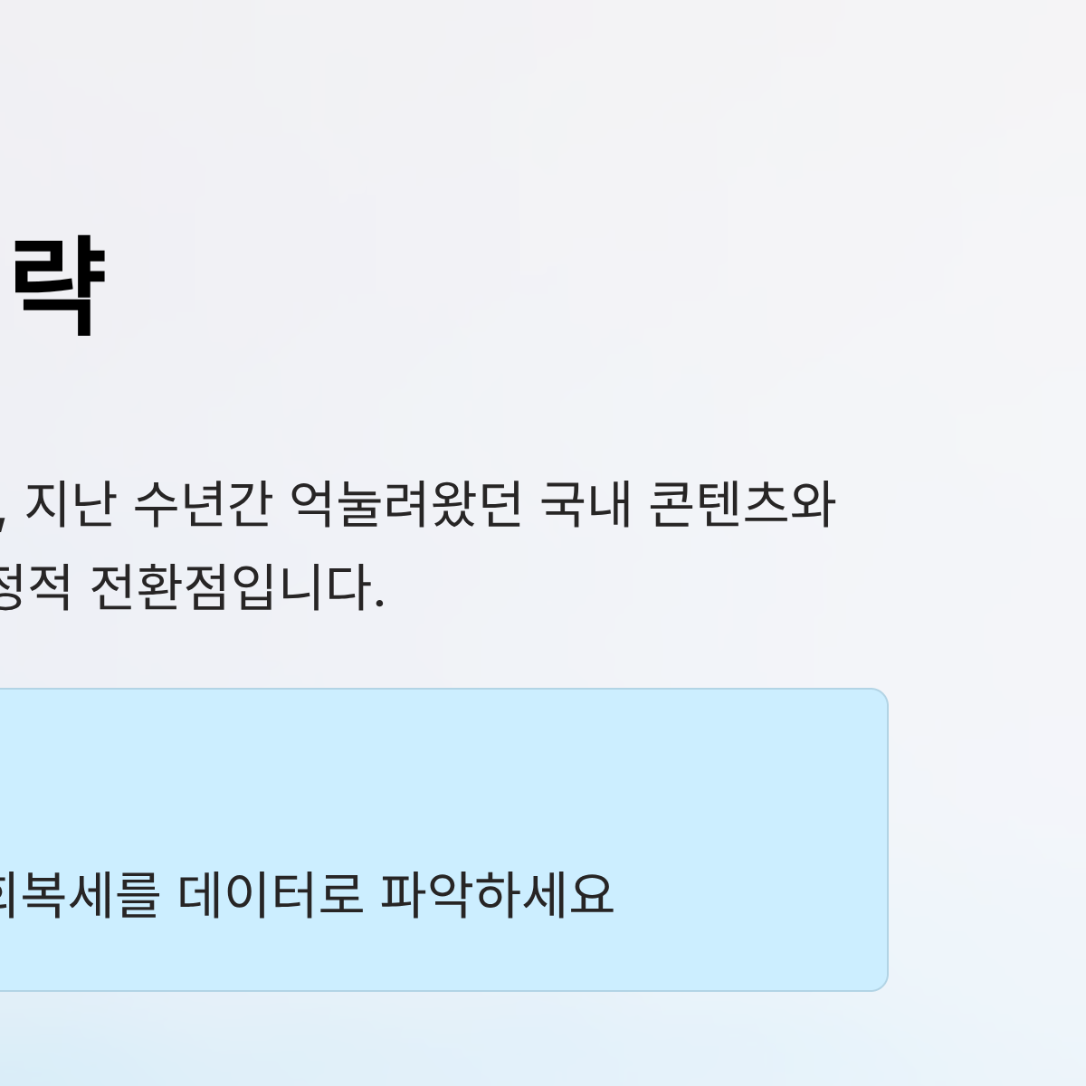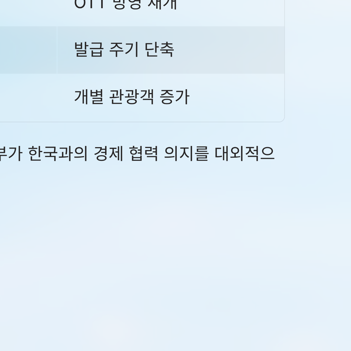 | 콘텐츠 수출 | 한국 드라마/영화 방영 전면 중단 | OTT 내 한국관 신설 및 방영 재개 | 문화 콘텐츠 수익원 다각화 |