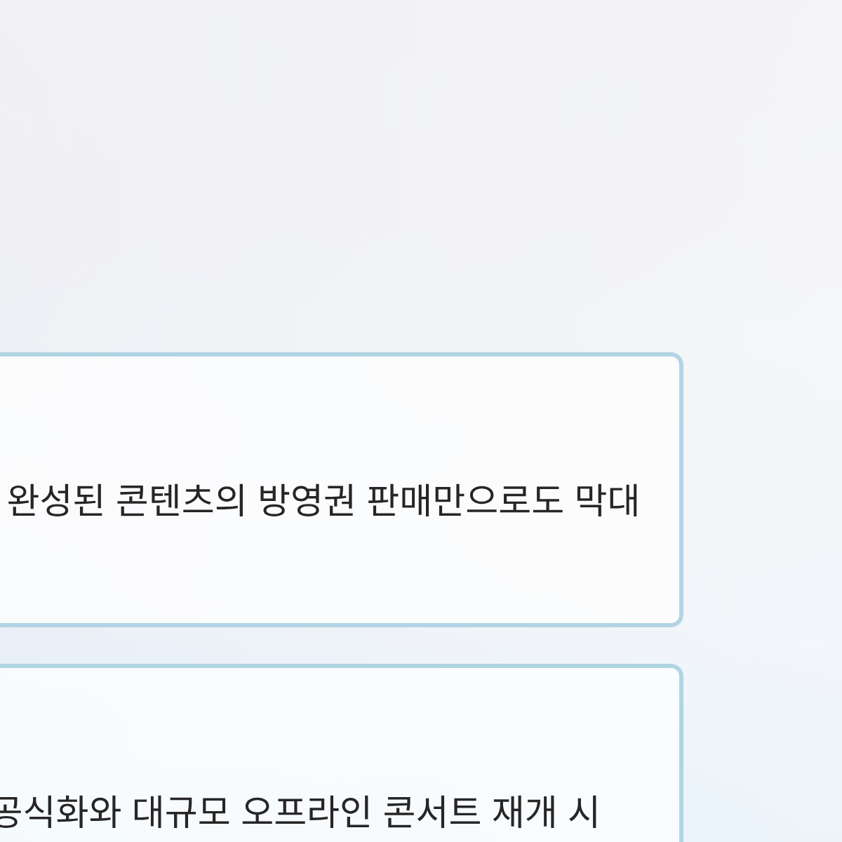 | 수혜 메커니즘 | 오프라인 콘서트 및 팬미팅 재개 | 음원 스트리밍 및 굿즈(MD) 판매 | 대규모 모객 가능 여부 |