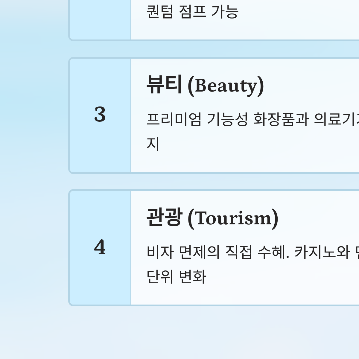 * 관광: 기대수익(중간) / 리스크(환율 변동) / 핵심지표(입국자 수 및 면세점 매출액)