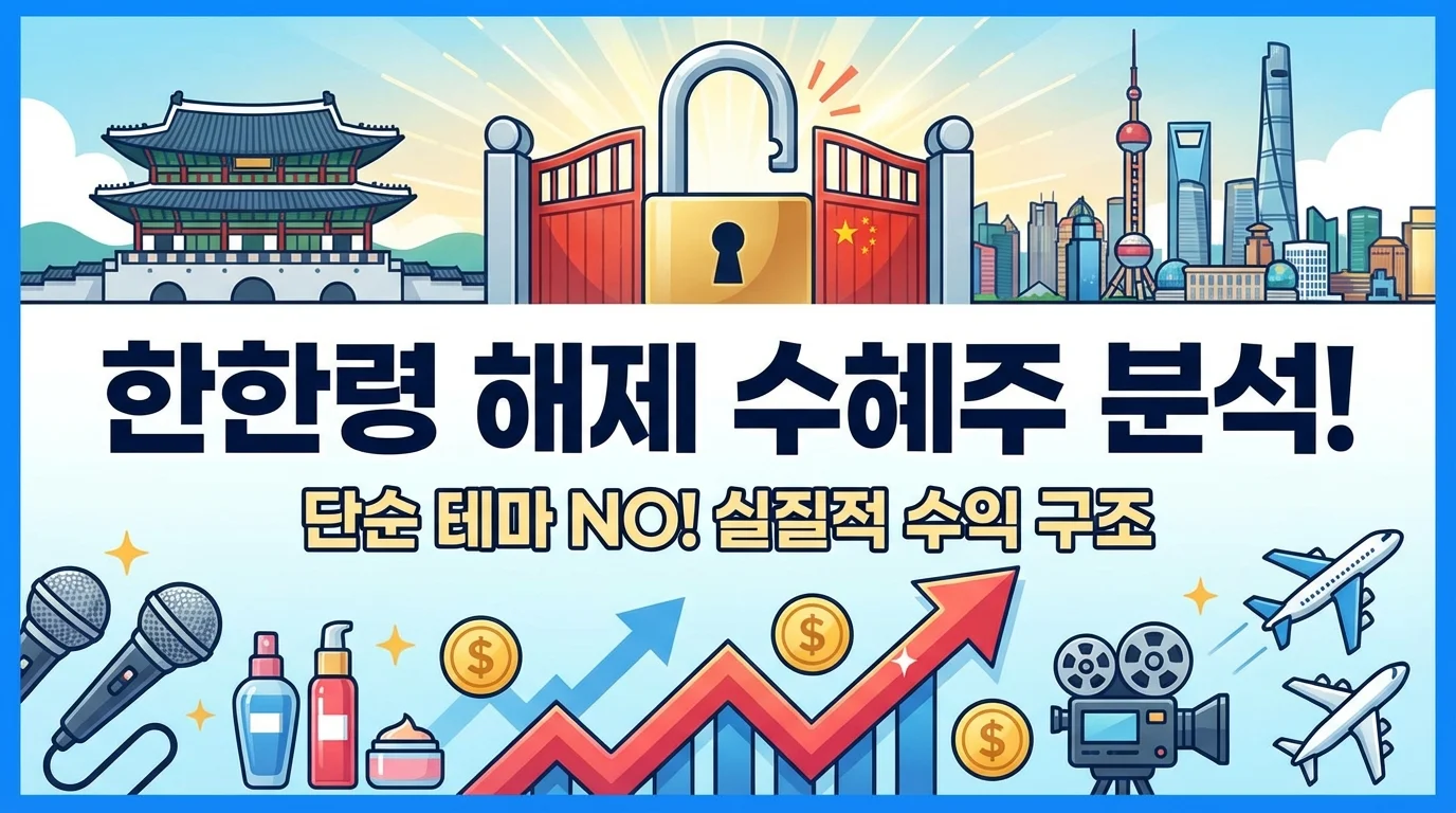 한한령 해제는 단순한 정치적 이슈를 넘어, 지난 수년간 억눌려왔던 국내 콘텐츠와 소비재 산업의 펀더멘털을 재평가하는 결정적인 전환점입니다. 본 가이드는 파편화된 뉴스들 사이에서 실질적인 실적 개선 가능성이 높은 8개 핵심 종목을 선별하고, 2026년까지 이어질 중장기 모멘텀을 입체적으로 분석하여 독자 여러분께 차별화된 투자 인사이트를 제공하고자 했습니다.