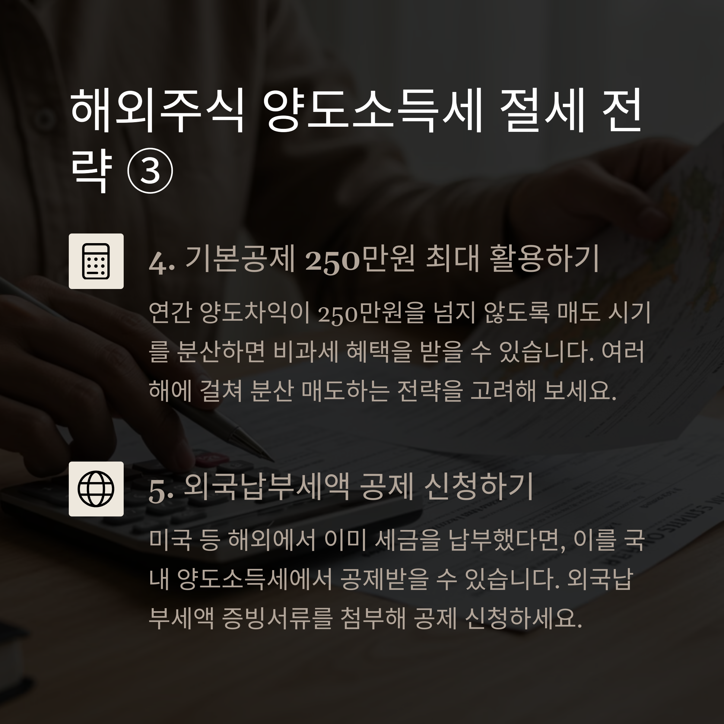 합법적인 절세 전략을 활용하여 세금 부담을 최소화하고, 투명한 신고로 가산세 부담 없이 투자 수익을 지키세요. 해외주식 투자의 진정한 수익은 세금까지 고려한 후에 결정됩니다!