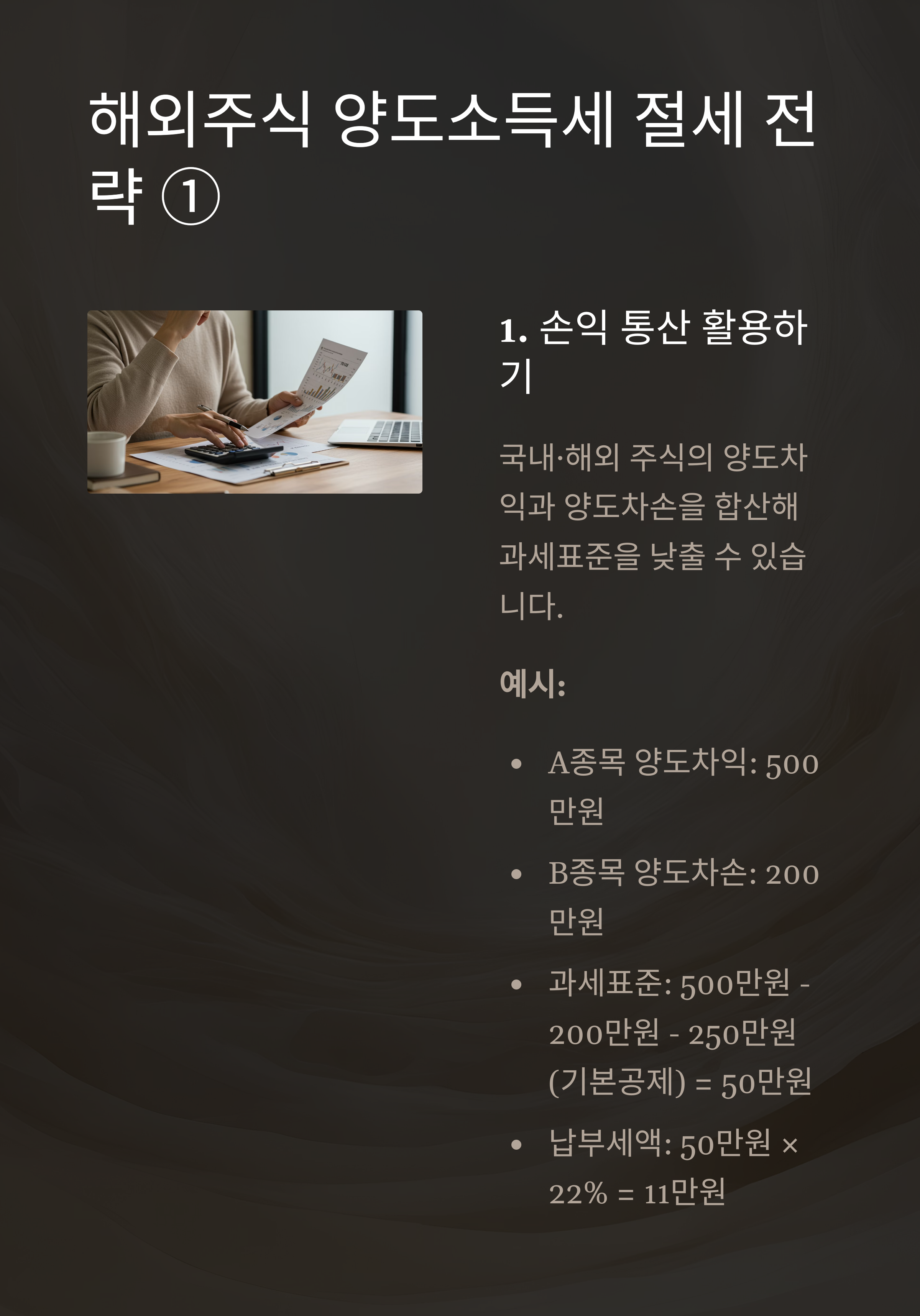 국내·해외 주식의 양도차익과 양도차손을 합산해 과세표준을 낮출 수 있습니다. 예를 들어: