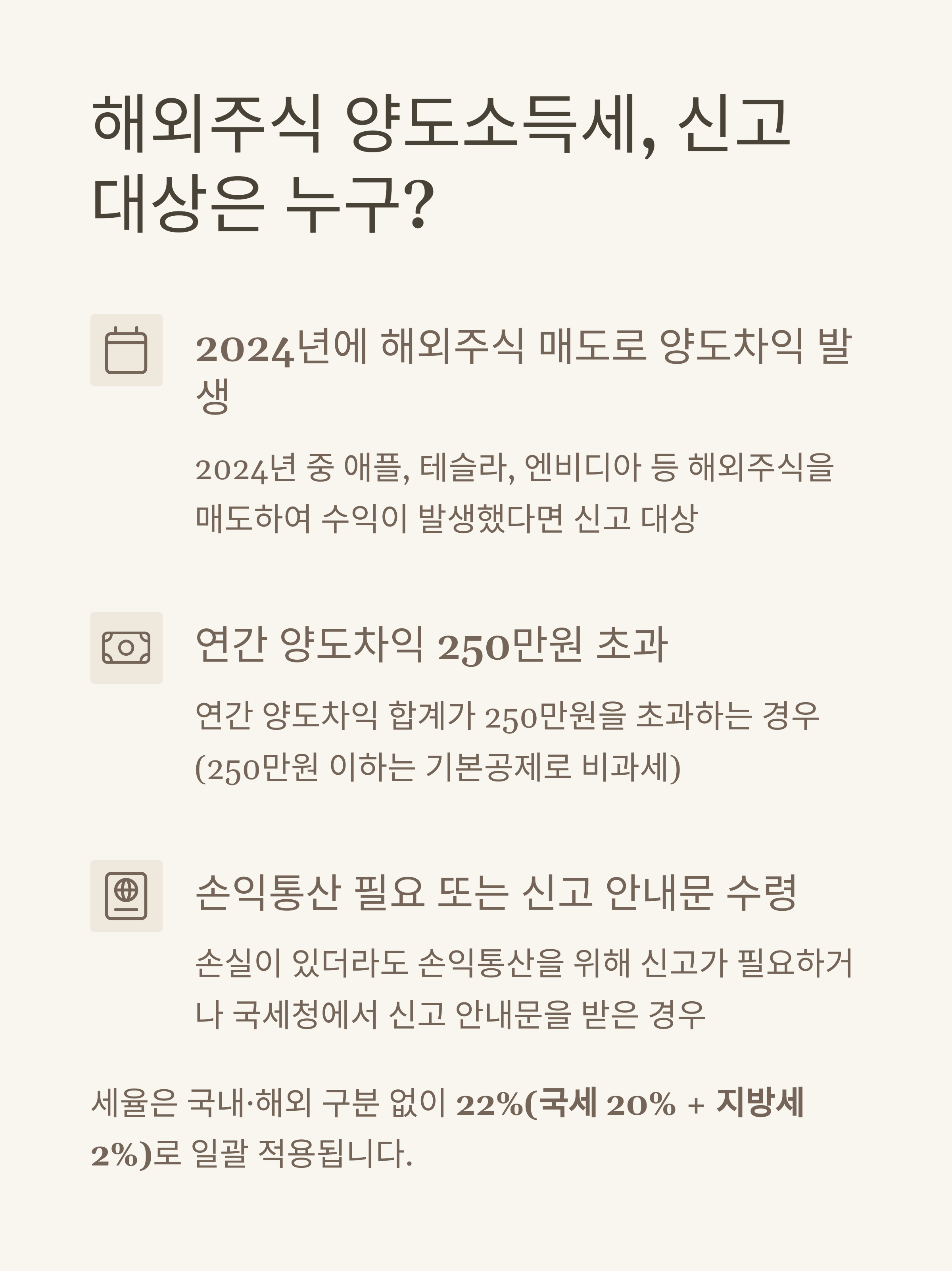 특히 2024년에 애플, 테슬라, 엔비디아 같은 인기 종목에 투자했다가 매도하여 수익이 발생했다면 2025년 5월에 반드시 신고해야 합니다. 신고를 놓치면 최대 20%의 무신고 가산세와 함께 매일 0.022%의 납부지연 가산세가 부과됩니다.