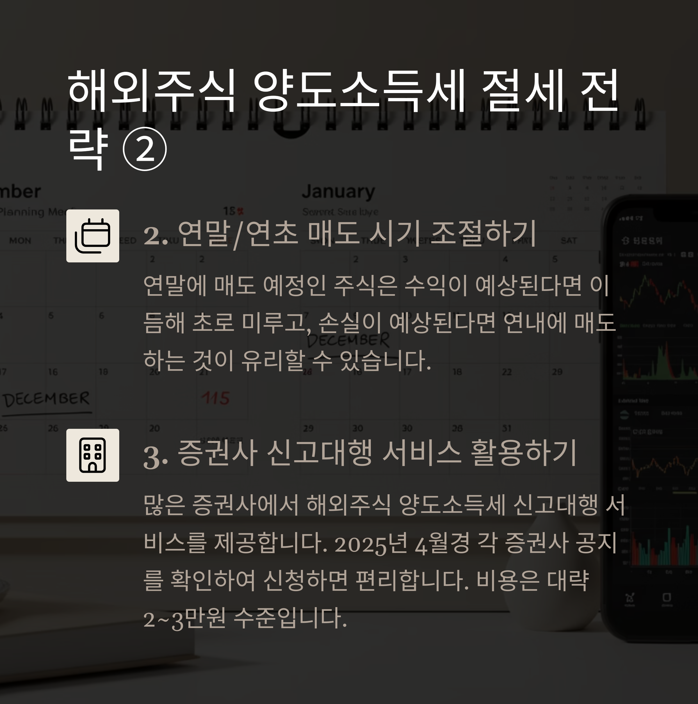 연말에 매도 예정인 주식은 수익이 예상된다면 이듬해 초로 미루고, 손실이 예상된다면 연내에 매도하는 것이 유리할 수 있습니다.