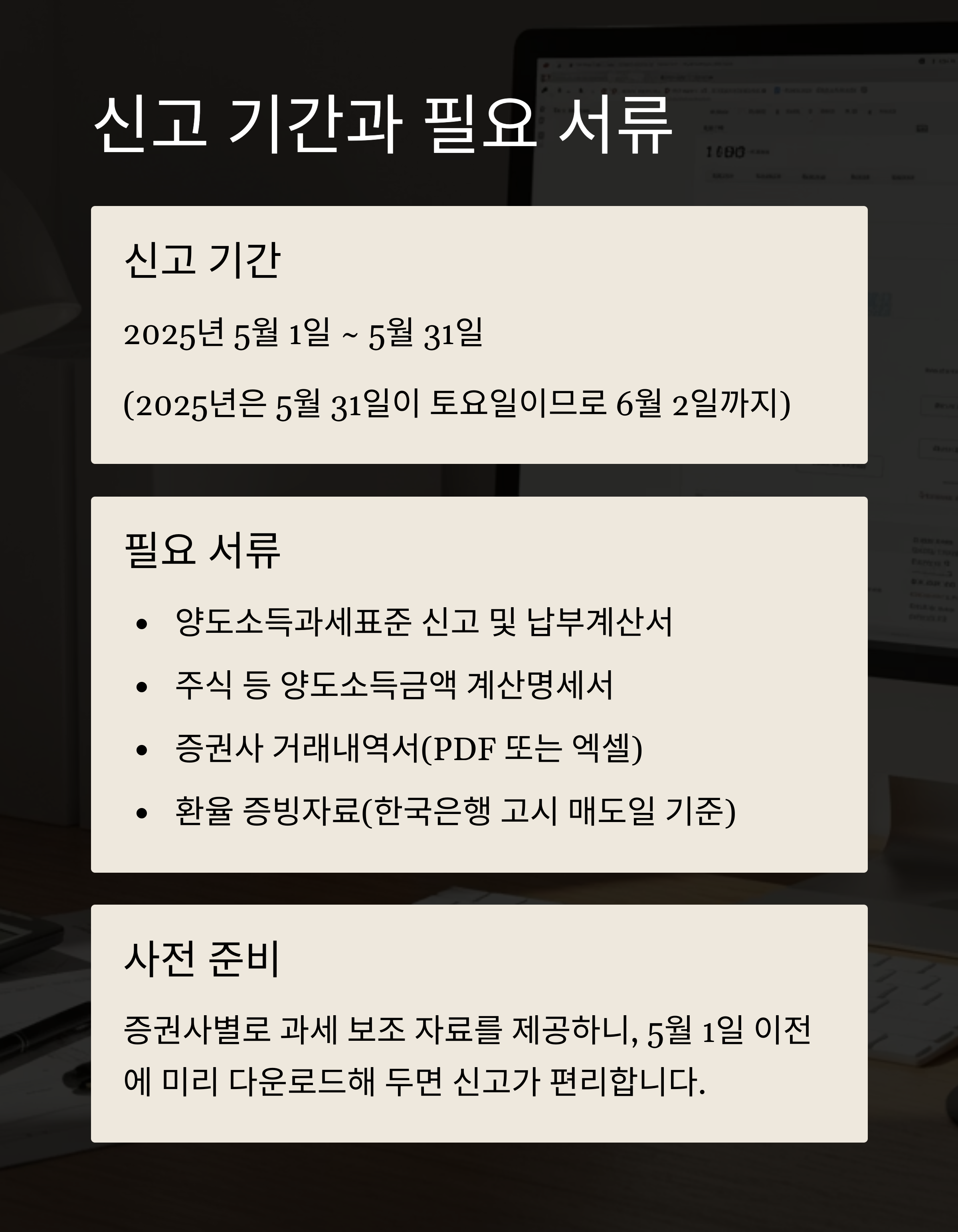 신고 기한을 놓치지 않도록 캘린더에 미리 표시해 두고, 복잡하다고 느껴지면 증권사의 신고대행 서비스나 전문가의 도움을 받는 것도 좋은 방법입니다.