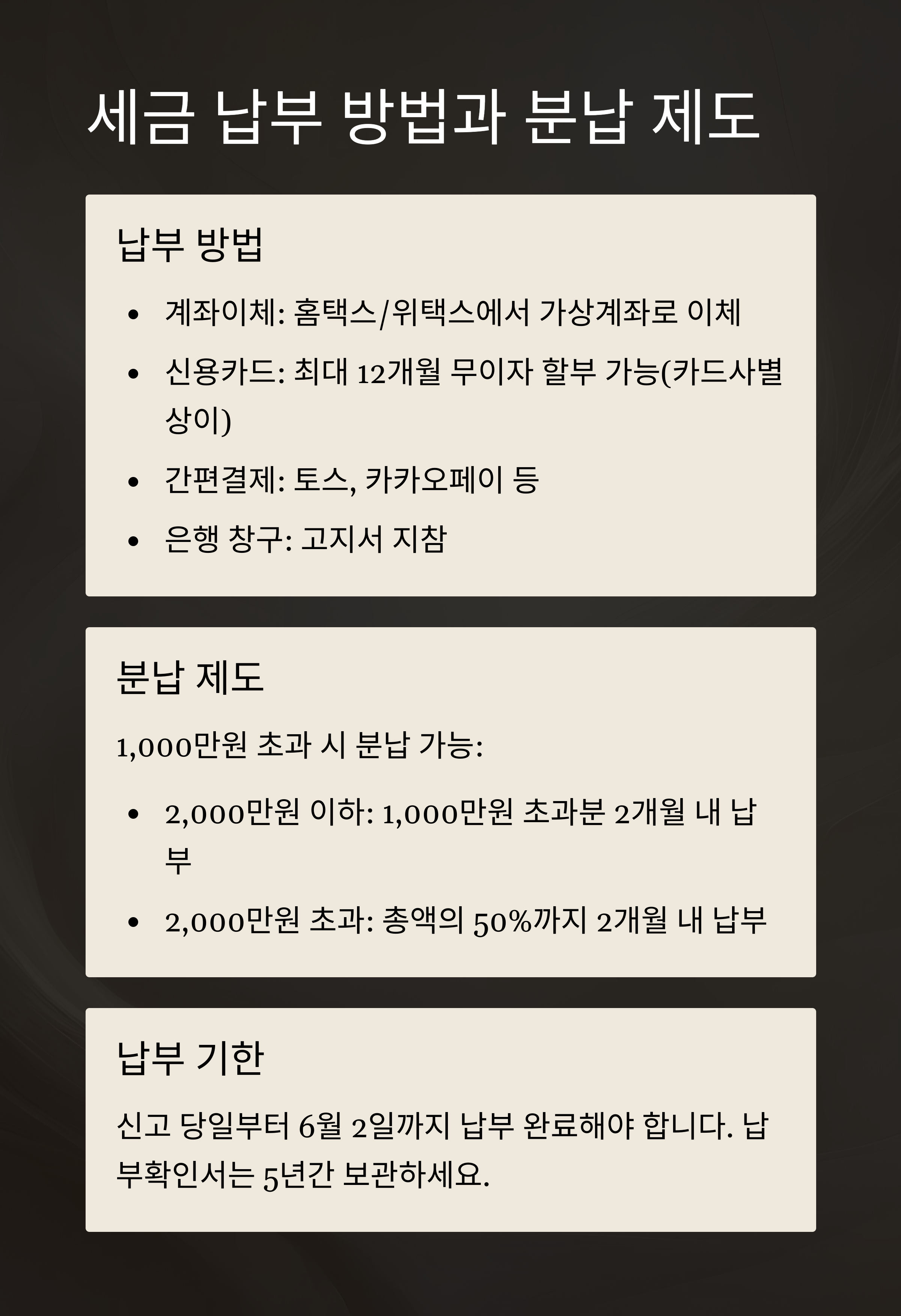 • 2,000만원 초과: 총액의 50%까지 2개월 내 납부