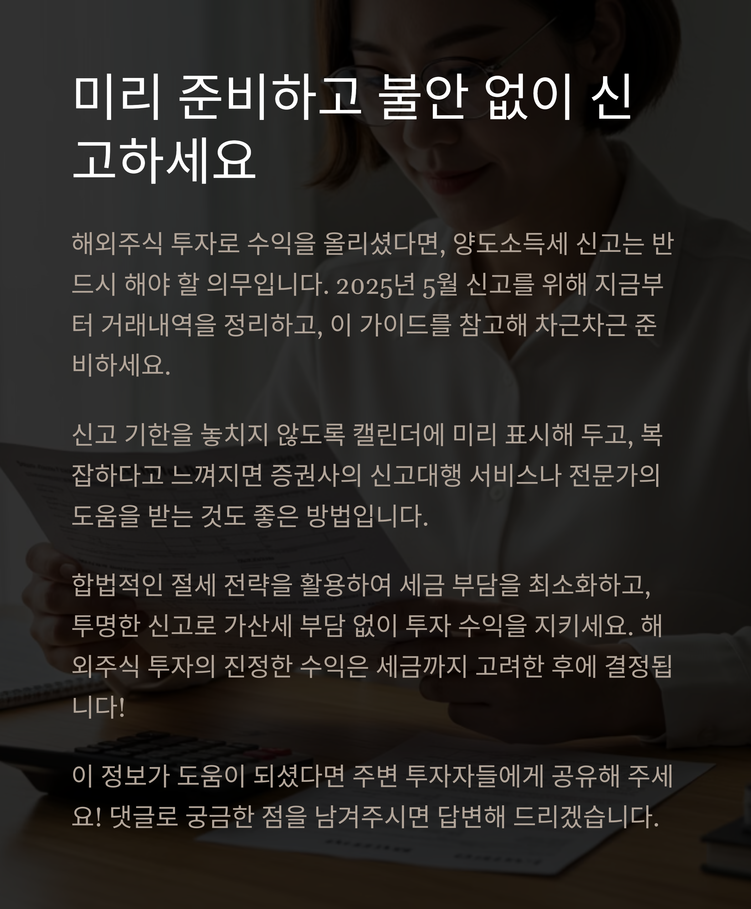 신고 기한을 놓치지 않도록 캘린더에 미리 표시해 두고, 복잡하다고 느껴지면 증권사의 신고대행 서비스나 전문가의 도움을 받는 것도 좋은 방법입니다.