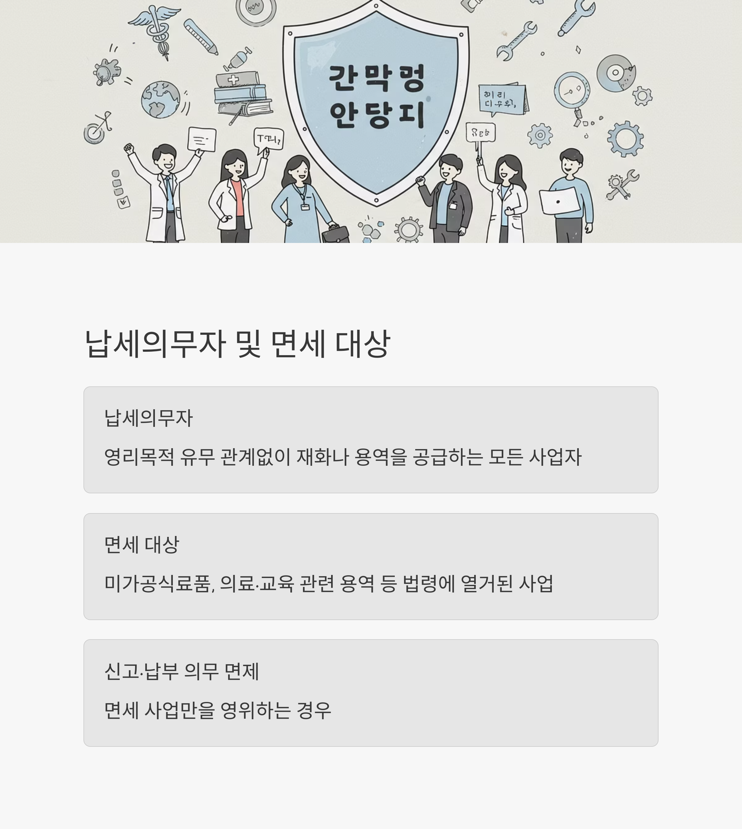 - 면세 대상: 미가공식료품, 의료·교육 관련 용역 등 법령에 열거된 사업