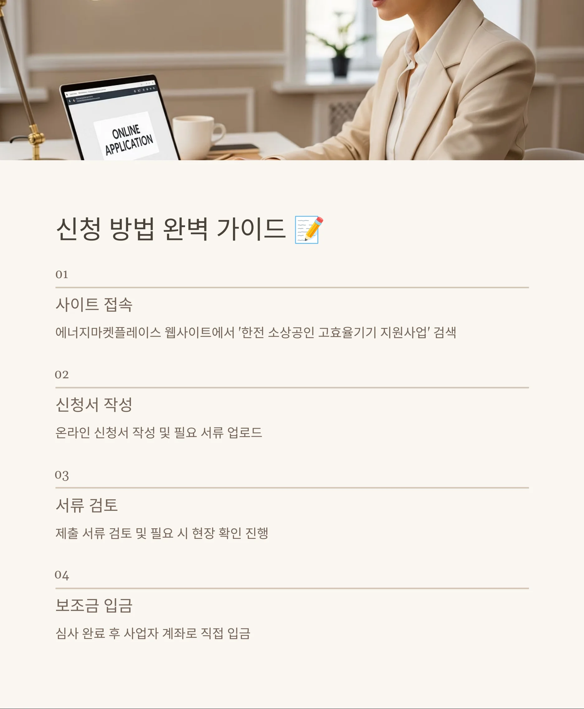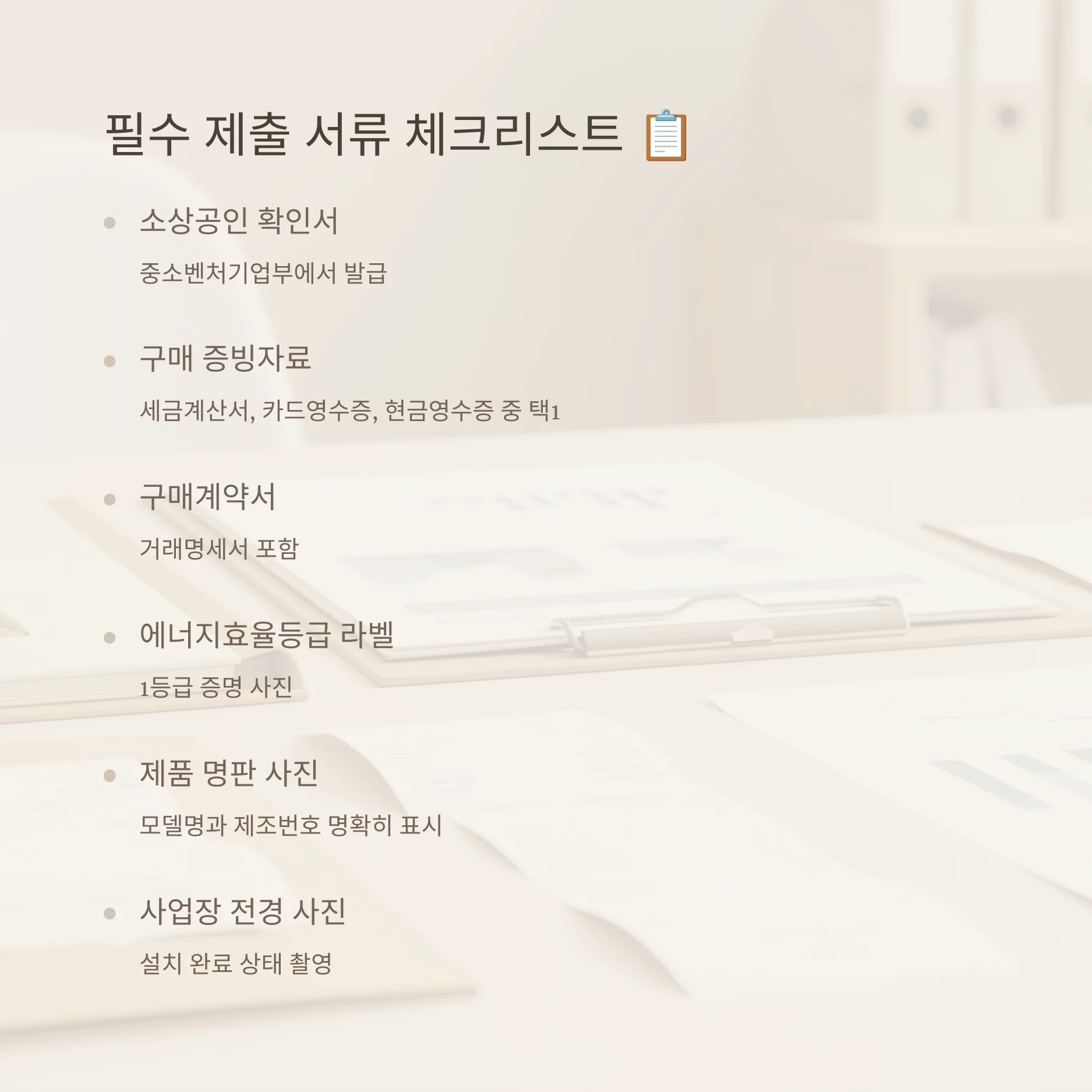 A: 신청 시 소상공인 확인서, 제품 구매 증빙자료, 에너지효율등급 라벨 사진 등이 필요합니다. 정확한 서류 준비는 심사 과정에서 중요합니다.