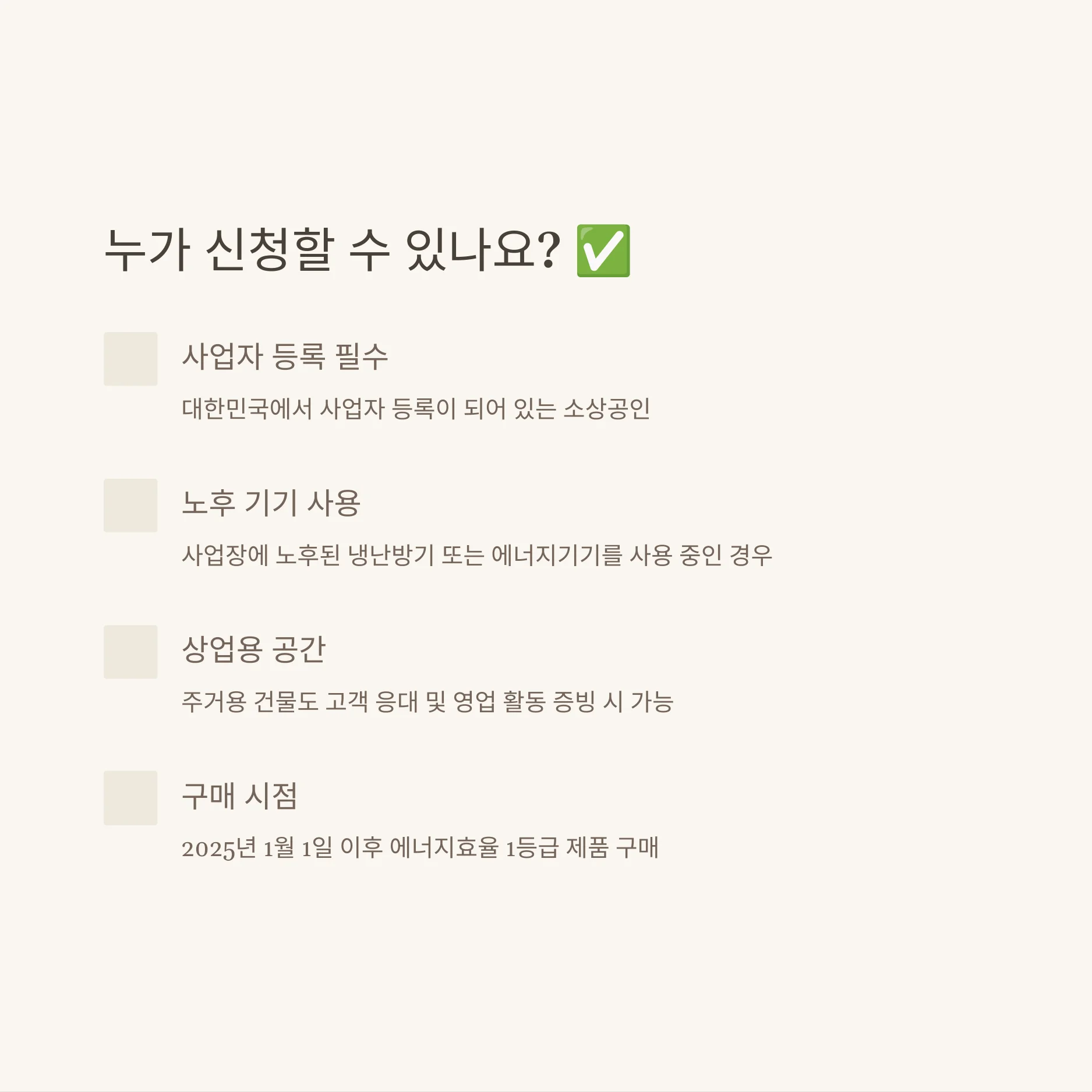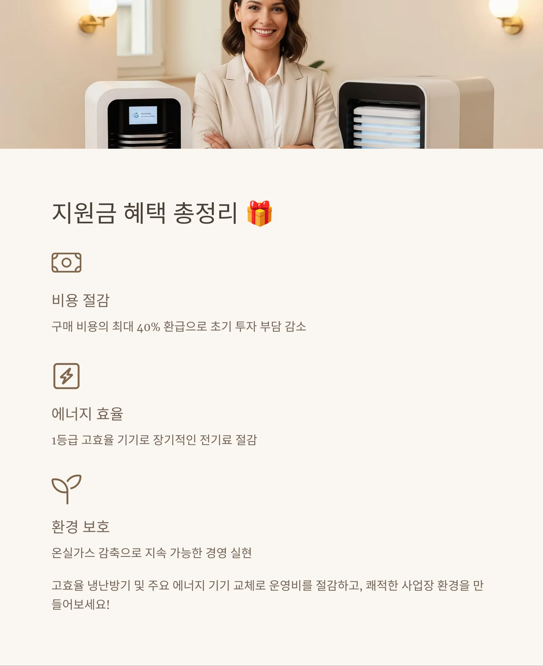 소상공인 난방비 지원금은 에너지 효율을 높이고 비용 부담을 줄일 수 있는 기회를 제공합니다. 2025년에는 고효율 냉난방기 및 주요 에너지 기기 교체 시 최대 40%의 비용을 지원받을 수 있어, 소상공인의 운영비 절감에 큰 도움이 될 것입니다. 이 기회를 통해 에너지 비용을 절감하고 환경 보호에 기여할 수 있습니다. 신청을 서두르지 않으면 예산이 조기 소진될 수 있으니, 필요한 소상공인은 지금 바로 신청 준비를 시작하세요. 정부의 지원을 통해 지속 가능한 사업 운영을 실현해보세요.