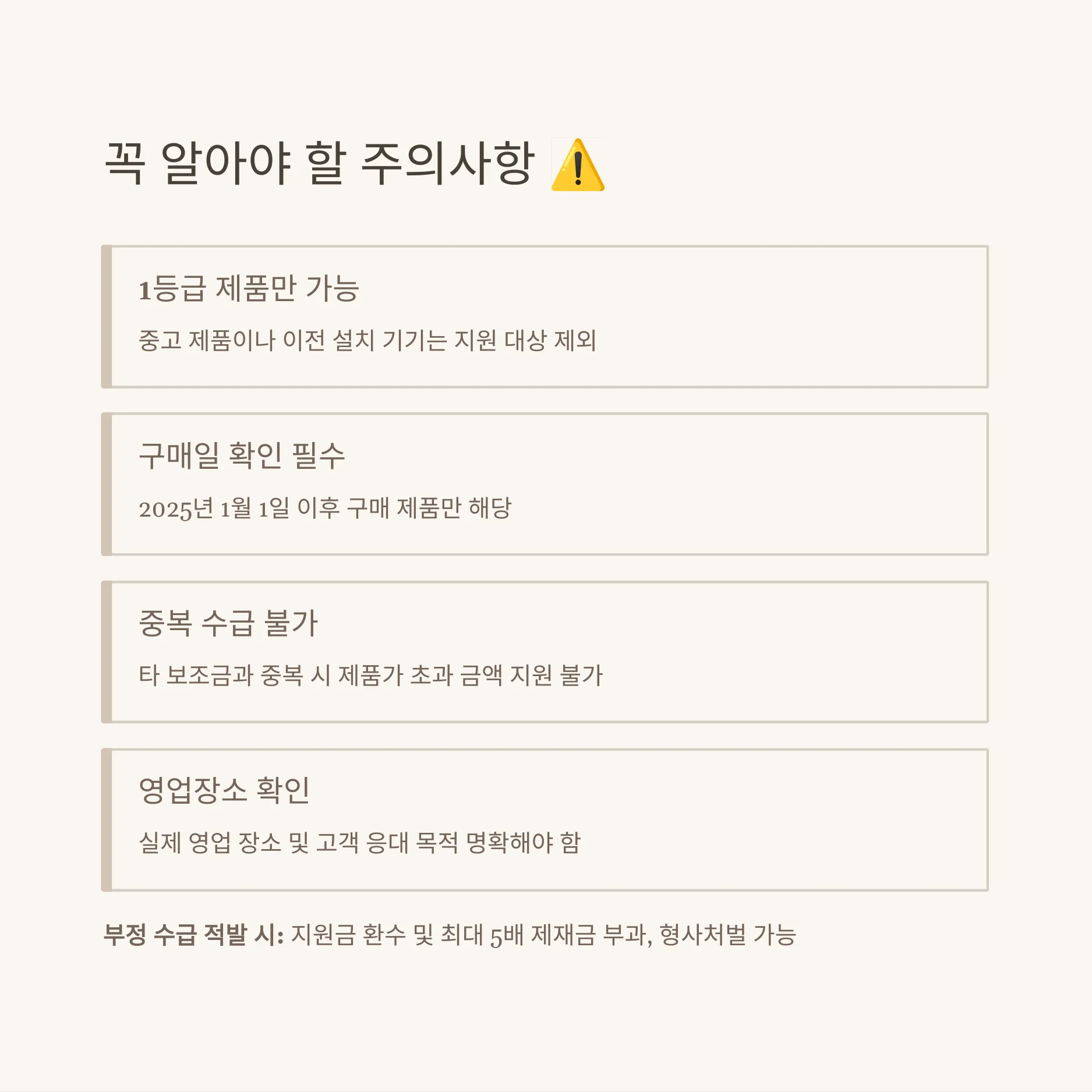 소상공인 난방비 지원금 신청 시 몇 가지 유의해야 할 사항이 있습니다. 먼저, 신청 가능한 제품은 에너지 효율 1등급 제품으로 제한되며, 중고 제품이나 이전에 설치된 기기는 지원 대상에서 제외됩니다. 또한, 제품 구매일은 2025년 1월 1일 이후여야 하며, 이 날짜 이전에 구매한 제품은 지원을 받을 수 없습니다. 지원금은 중복 수급이 불가능하며, 타 보조금과의 중복 지원 시 제품가 초과 금액은 지원받을 수 없습니다. 실제 영업 장소가 아닌 곳에 설치된 경우나, 고객 응대 목적이 불분명한 경우에도 부적격 처리될 수 있습니다. 부정 수급이 적발될 경우 지원금 환수 및 최대 5배의 제재금이 부과될 수 있으며, 형사처벌도 가능하므로 주의해야 합니다. 마지막으로, 신청은 선착순으로 진행되며, 예산이 조기 소진될 수 있으므로 가능한 한 빨리 신청하는 것이 중요합니다. 이러한 사항을 철저히 확인하고 준비하여 신청해야 지원금을 받을 수 있습니다.