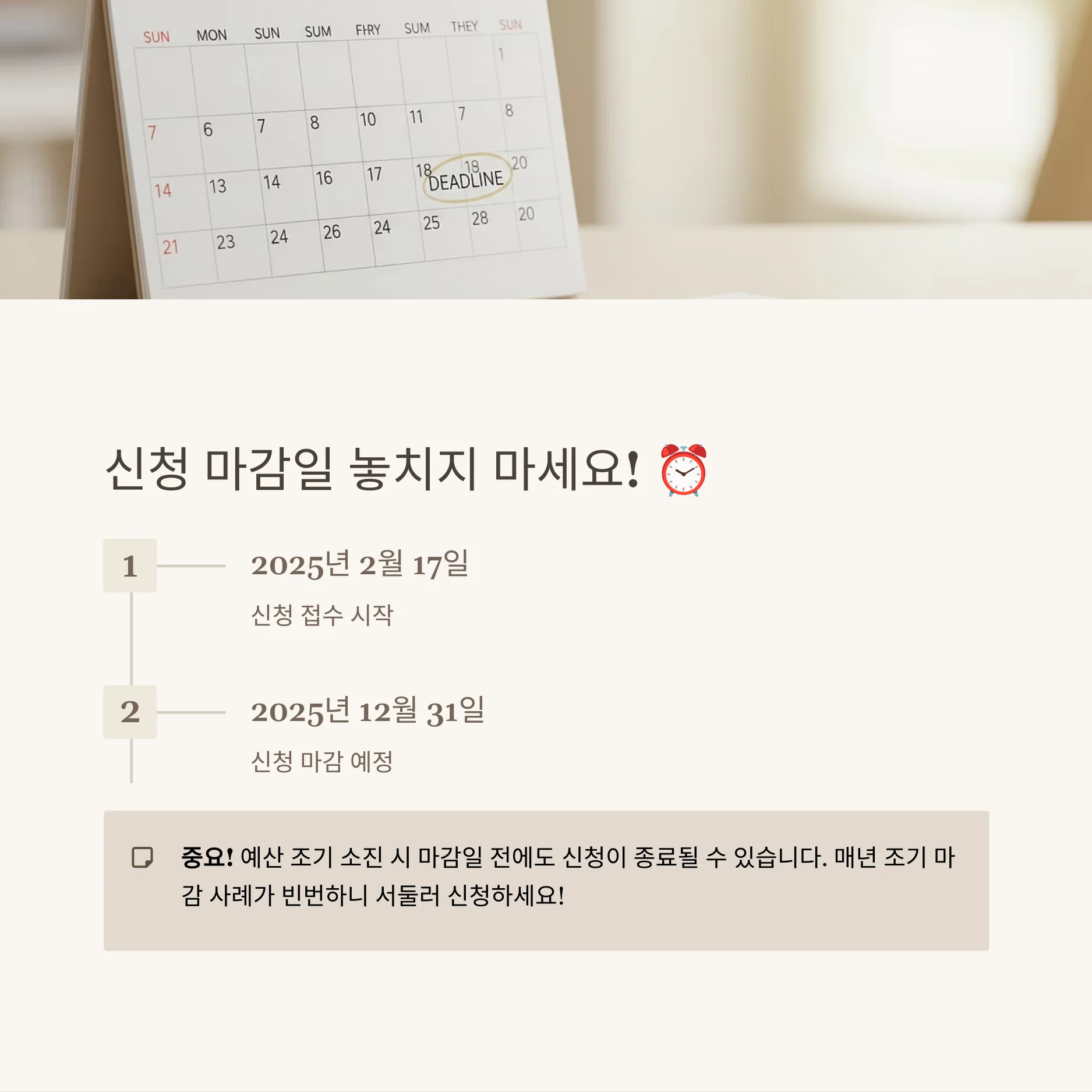 A: 신청은 2025년 2월 17일부터 12월 31일까지 가능합니다. 예산 소진 시 조기 마감될 수 있으니 빠른 신청이 필요합니다.