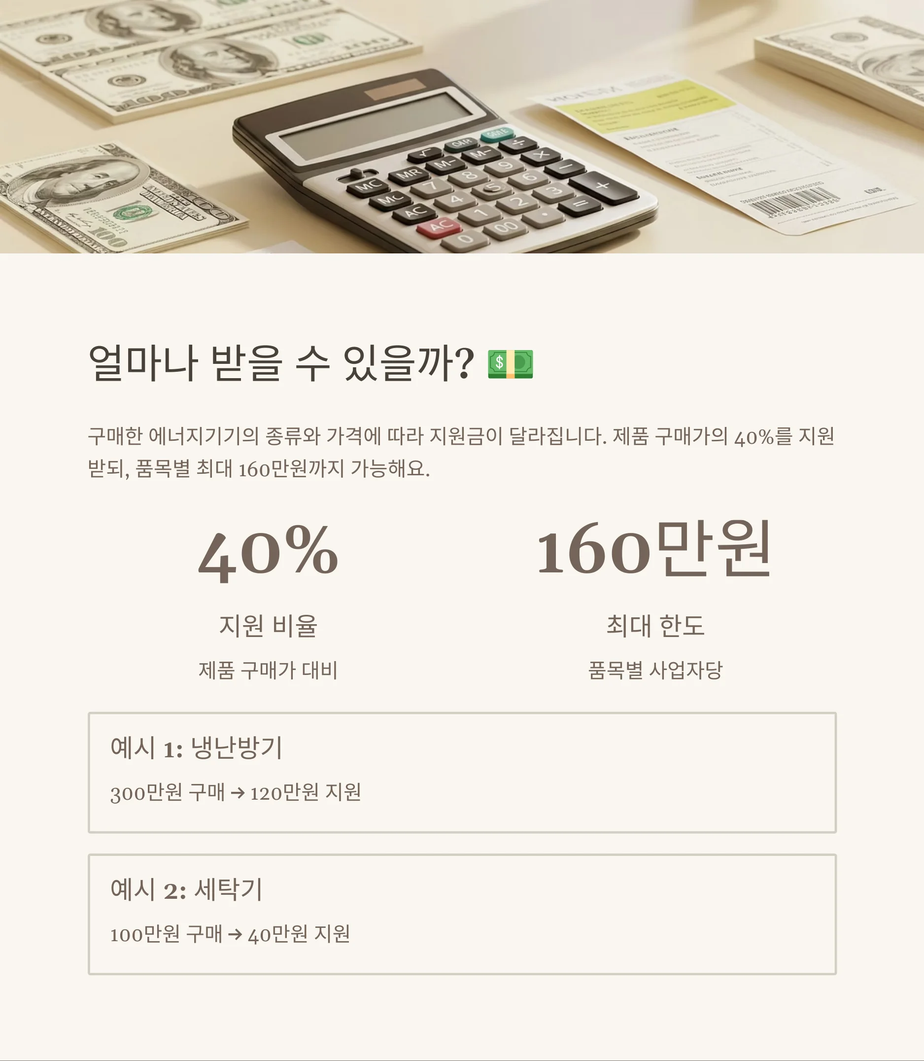 A: 냉난방기, 세탁기, 건조기 등 에너지효율 1등급 제품에 대해 지원됩니다. 각 품목별로 최대 160만 원까지 지원받을 수 있습니다.