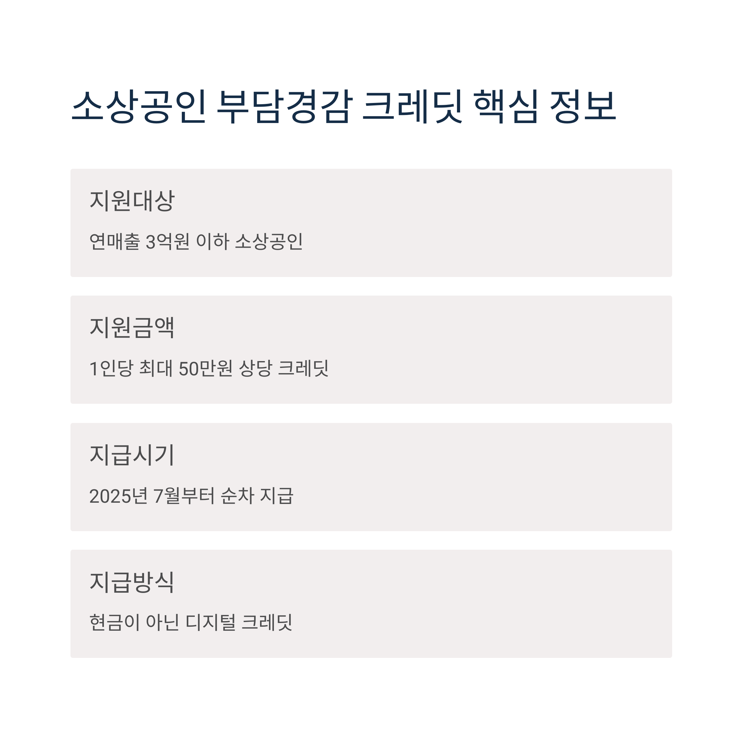 소상공인 부담경감 크레딧은 현금이 아닌 실사용 크레딧 방식으로 경영 부담을 실질적으로 줄이는 데 큰 도움이 될 것입니다. 지금 바로 내 사업장이 대상인지 확인하고, 7월 지급 시작에 맞춰 미리 준비하세요!