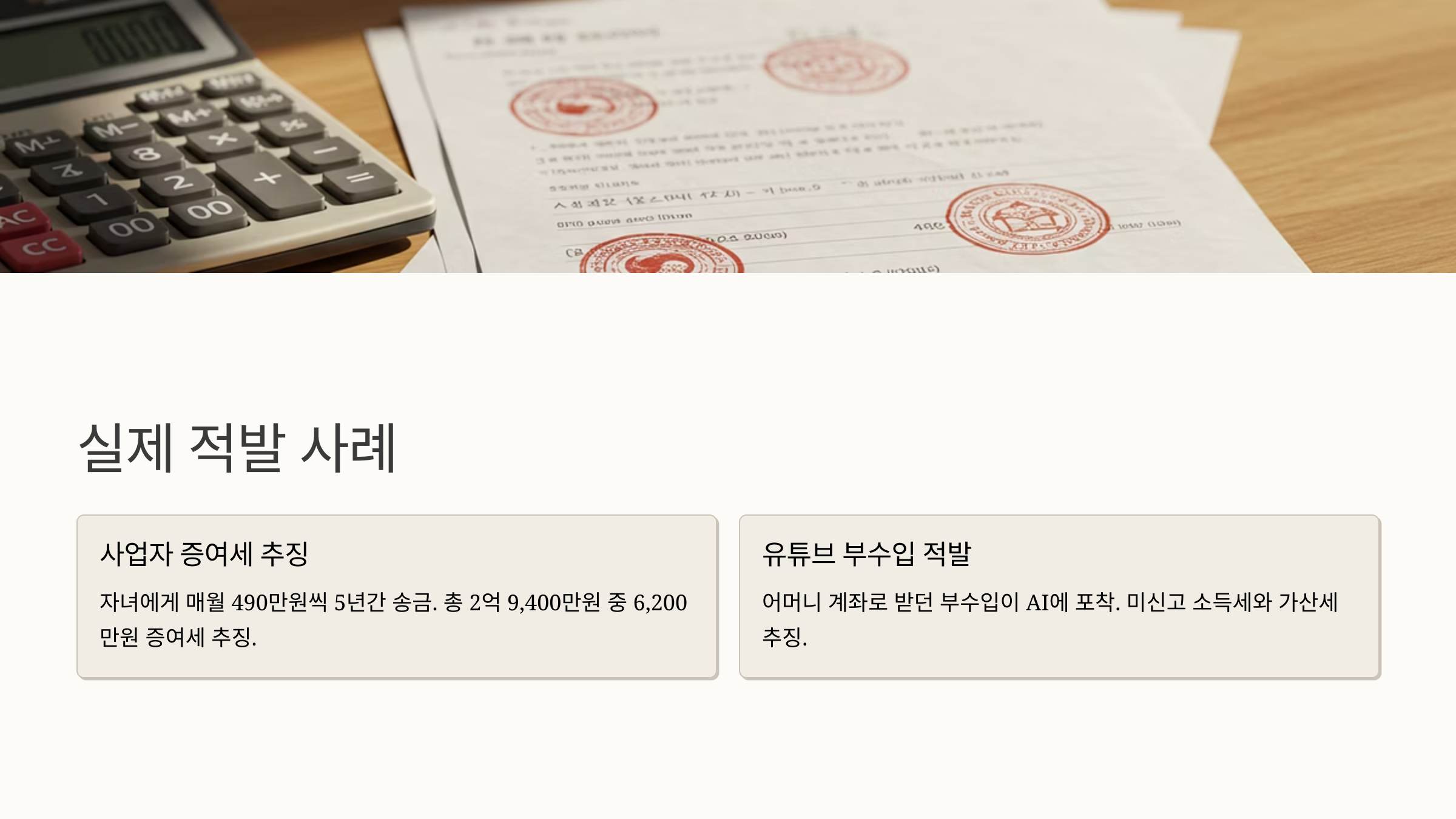 또 다른 사례로는 유튜브 부수입을 어머니 계좌로 받던 청년이 AI 시스템에 적발되어 미신고 소득에 대한 소득세와 가산세를 추징당한 경우도 있습니다.
