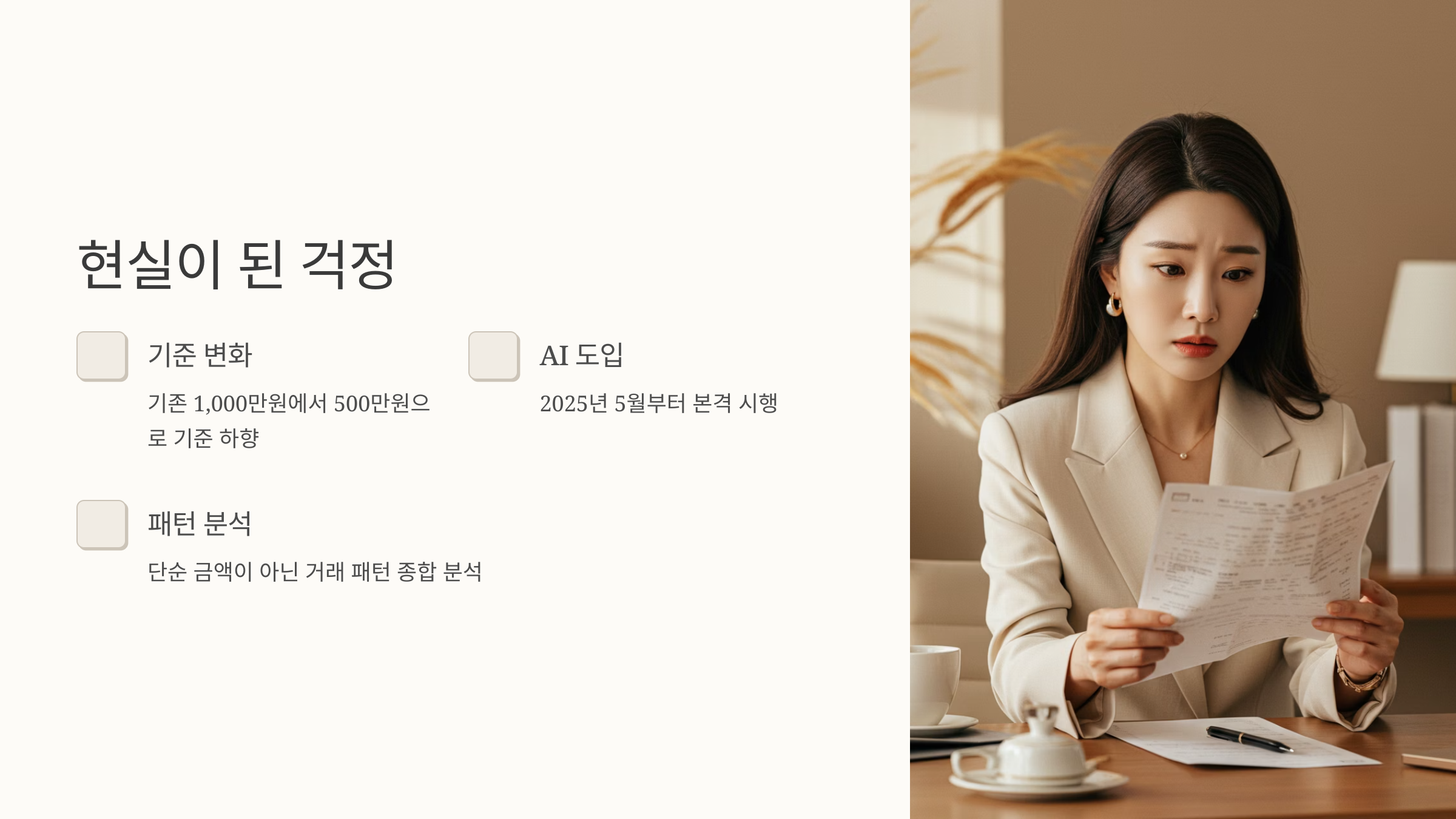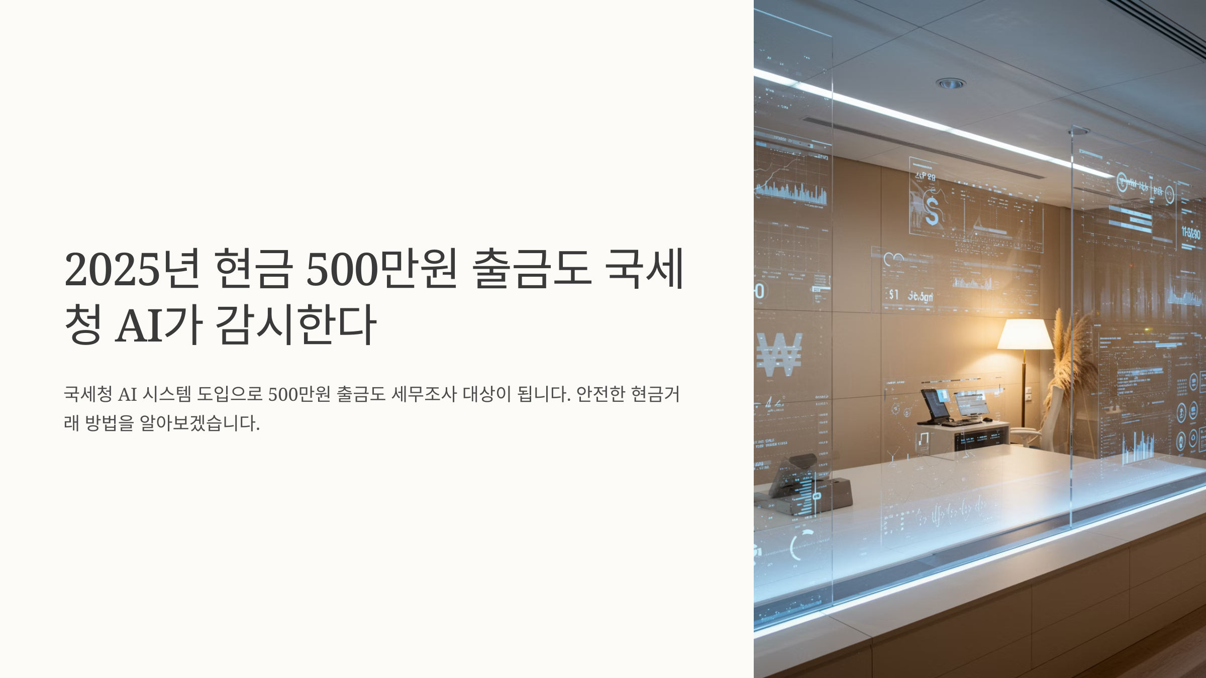 이제 이런 걱정이 단순한 기우가 아닌 현실이 되었습니다. 2025년 5월부터 국세청이 AI 시스템을 본격 도입하면서, 기존 1,000만원 기준이 아닌 500만원만 출금해도 세무조사 대상이 될 수 있는 시대가 열렸습니다.