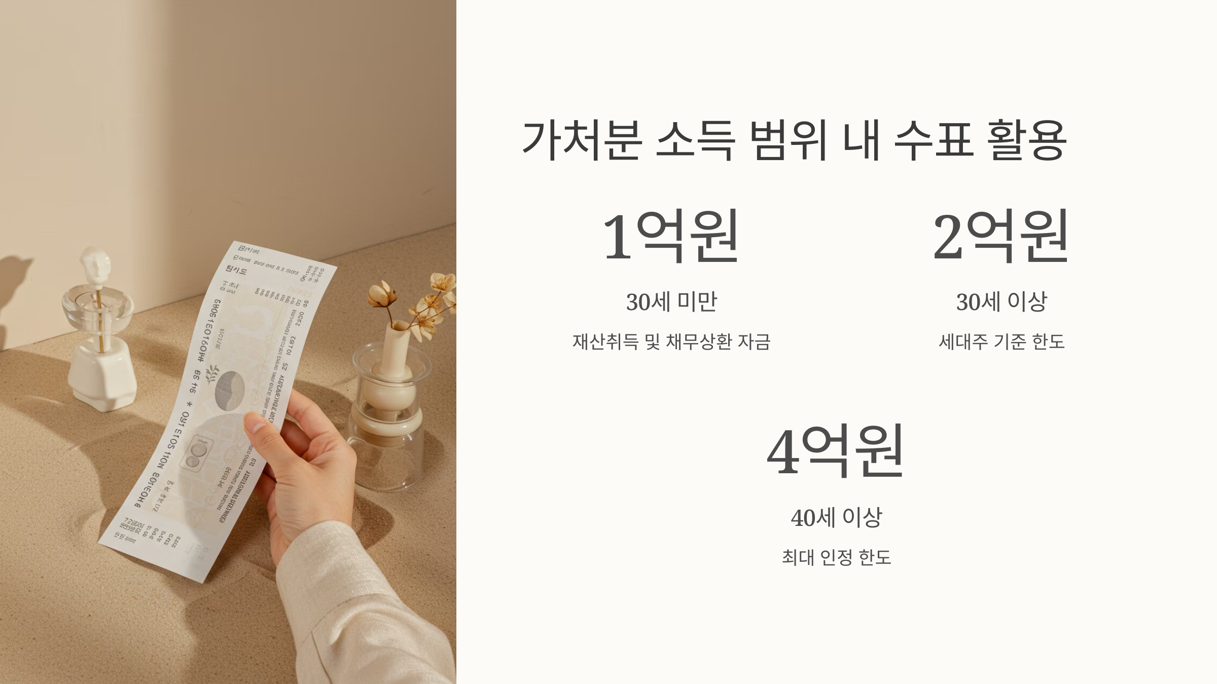- 30세 미만 세대주: 재산취득 및 채무상환 자금 합산 1억원까지