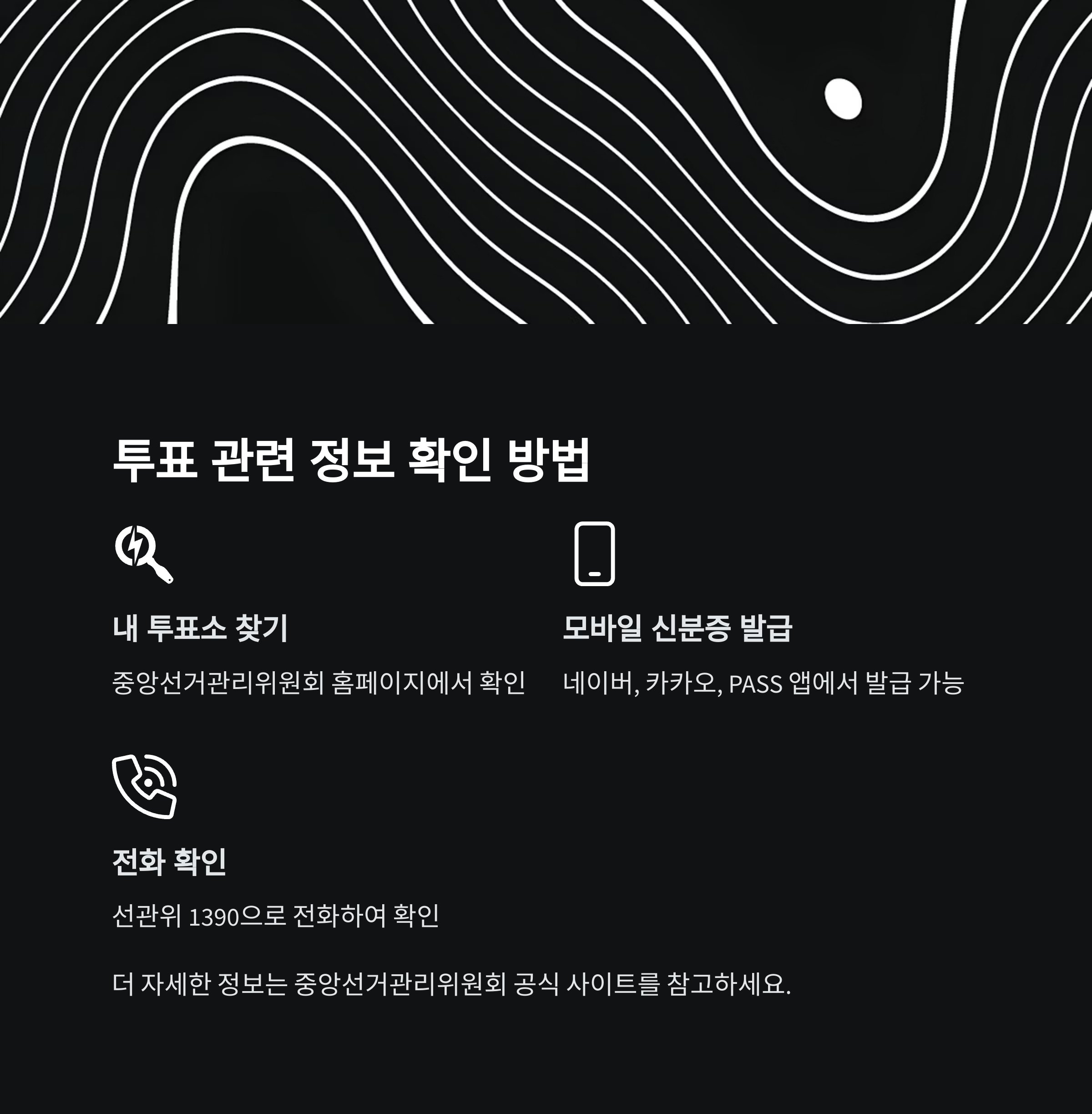 - 전화 문의: 1390 ARS에 전화하면 음성 또는 문자로 투표장소 안내를 받을 수 있습니다.