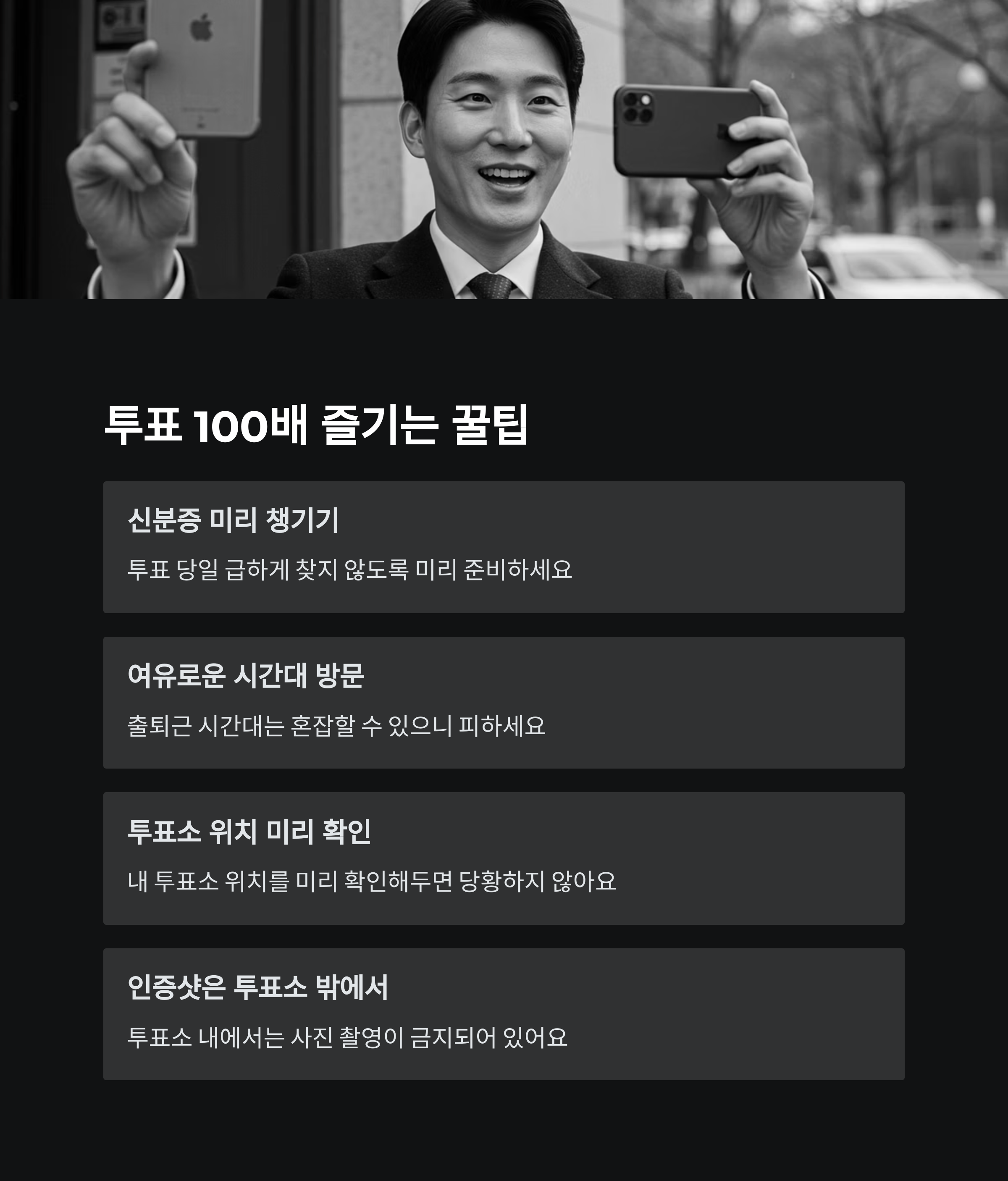 - 투표 인증샷은 투표소 밖에서: 투표소 내에서는 사진 촬영이 금지되어 있으니, 투표소 밖에서 인증샷을 남기세요.