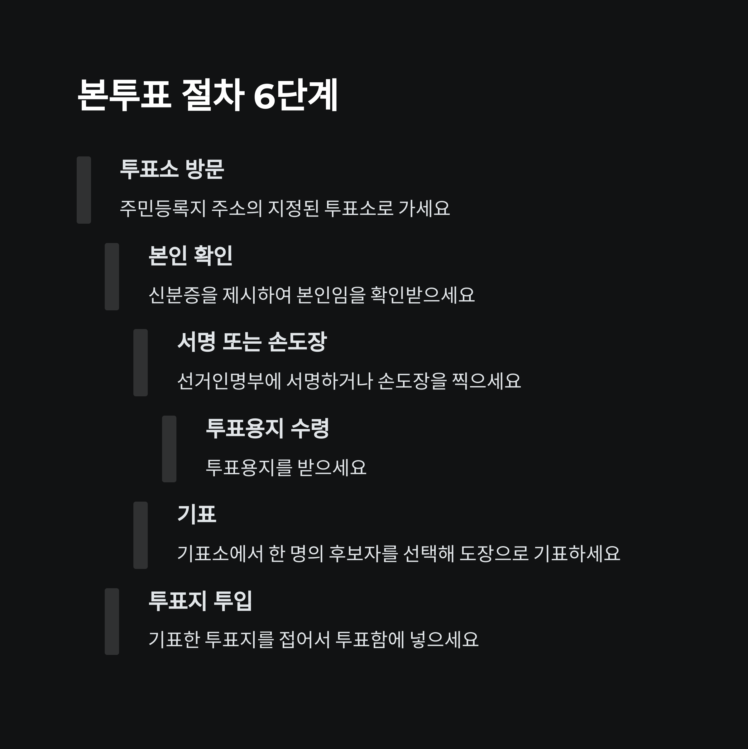 - 기표: 기표소에서 투표용지에 한 명의 후보자를 선택해 기표용구(도장)로 기표합니다. 여러 번 찍거나 기표란 밖에 찍으면 무효가 됩니다[2][4][8].