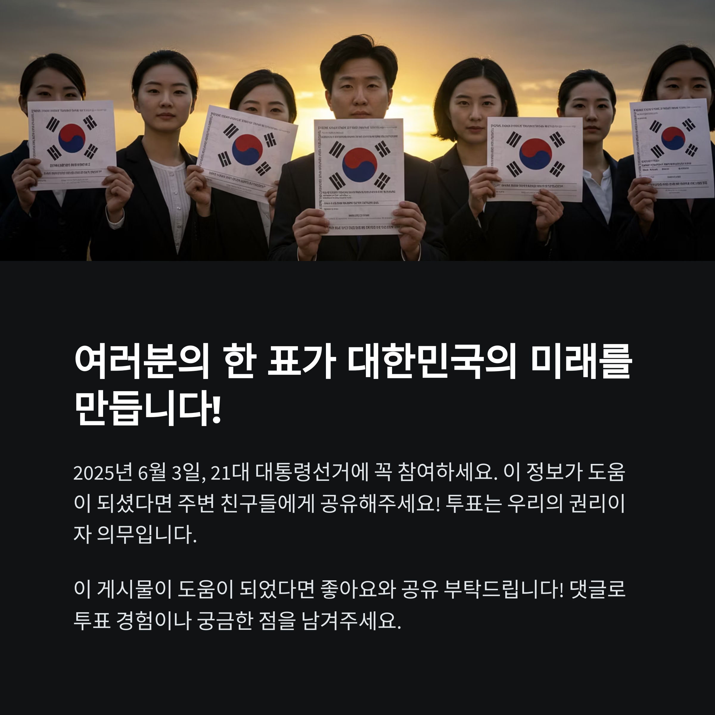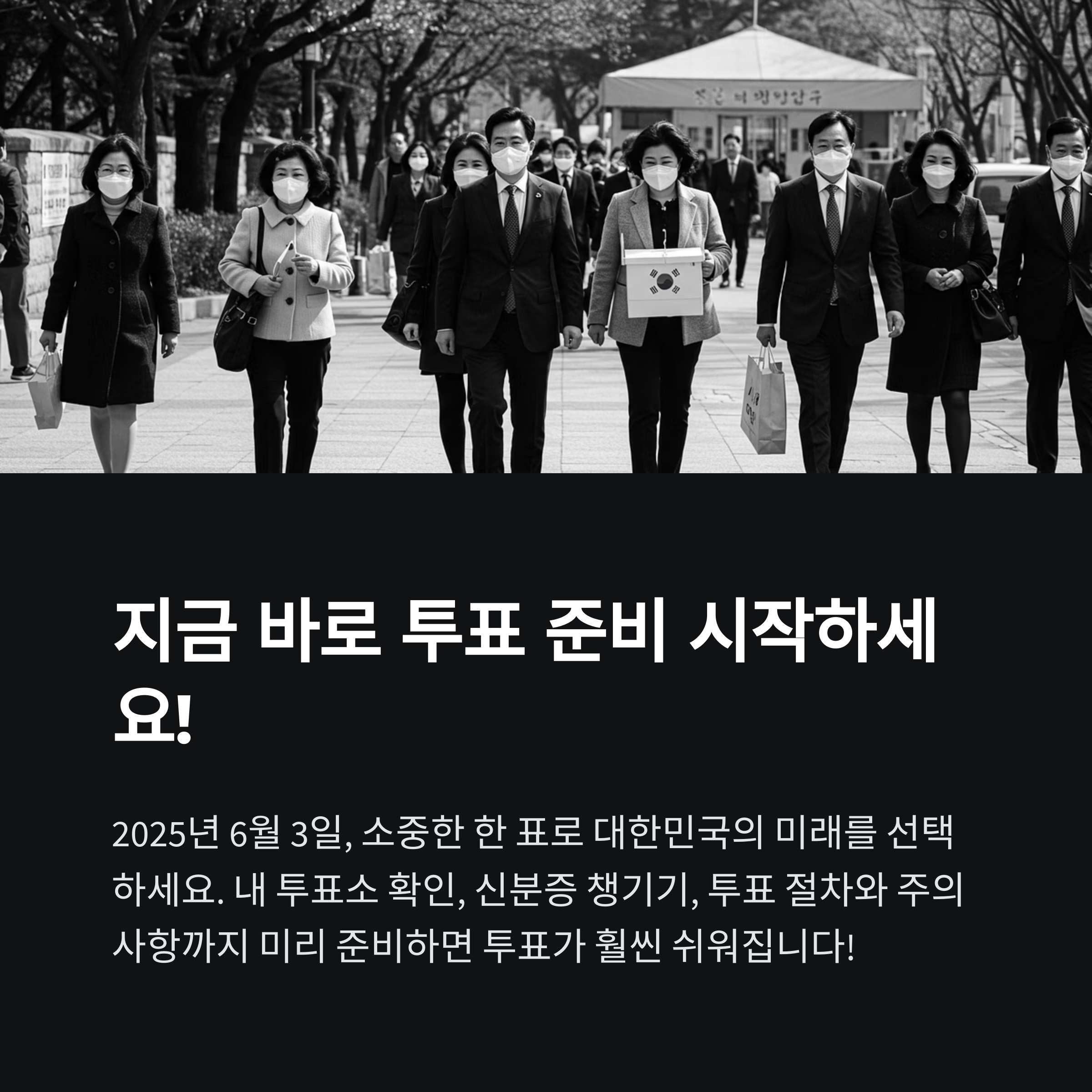2025년 6월 3일, 소중한 한 표로 대한민국의 미래를 선택하세요. 내 투표소 확인, 신분증 챙기기, 투표 절차와 주의사항까지 미리 준비하면 투표가 훨씬 쉬워집니다. 여러분의 한 표가 대한민국의 미래를 만듭니다!
