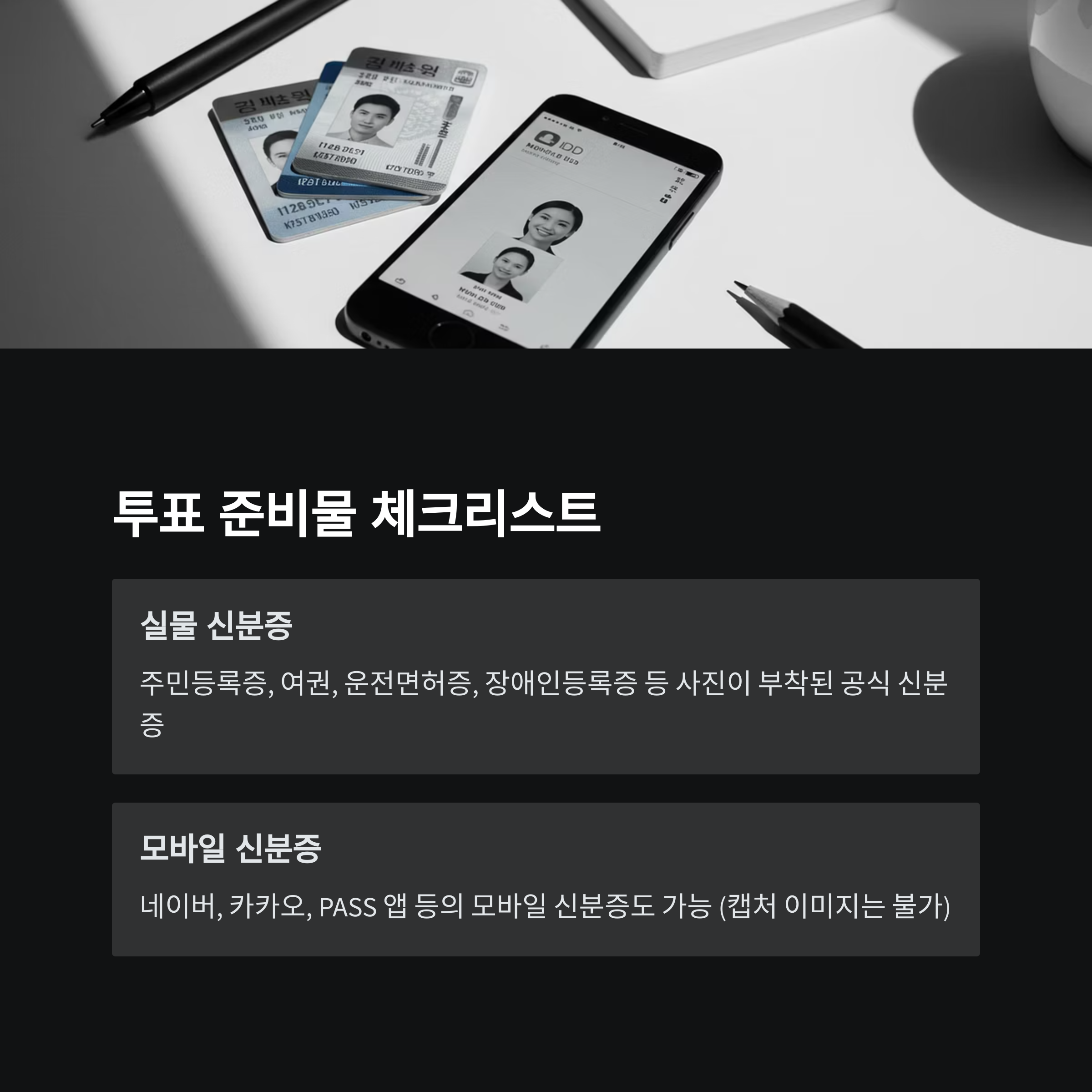 - 신분증 미리 챙기기: 투표 당일 급하게 찾지 않도록 미리 준비하세요.