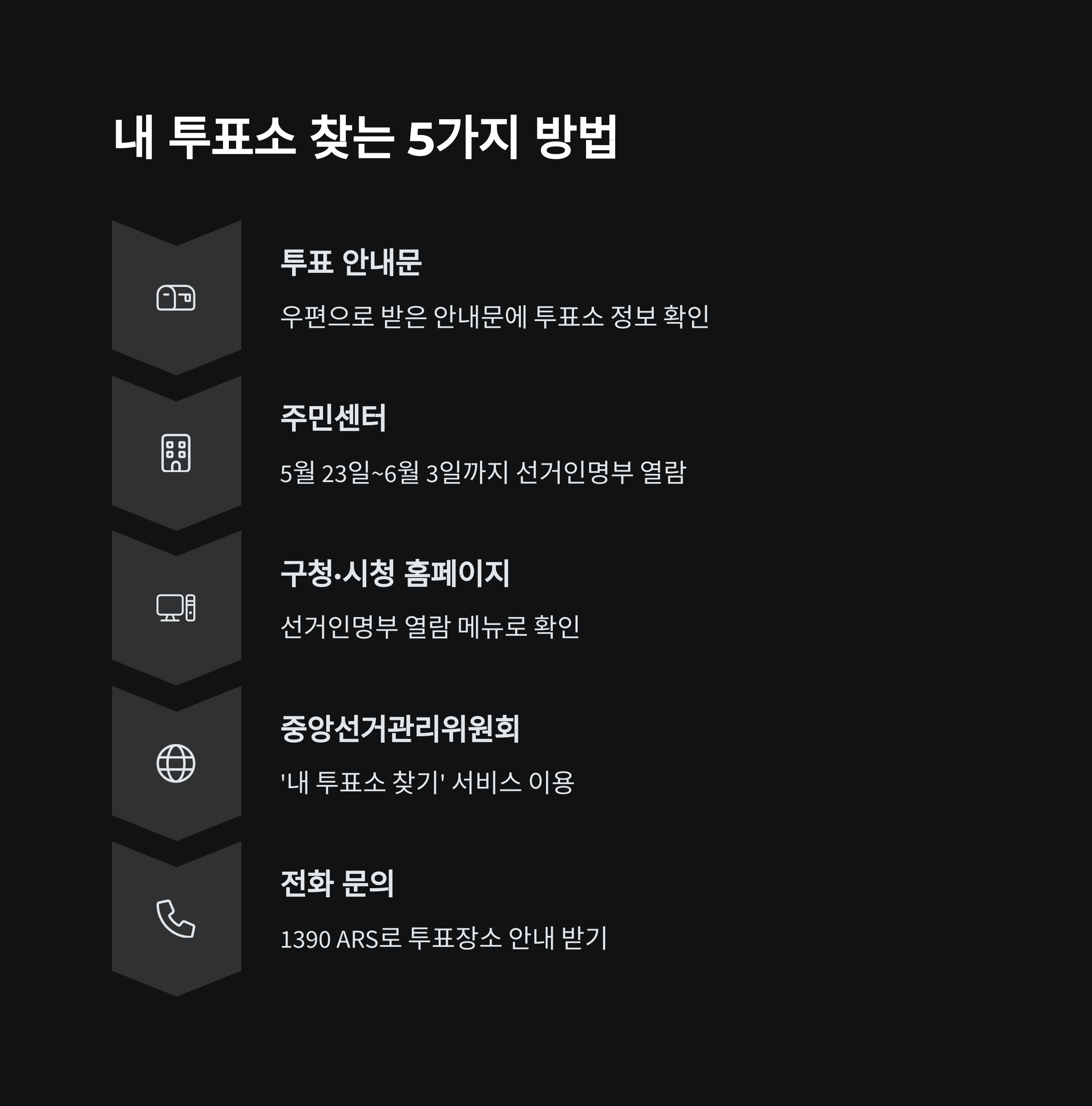 - 주민센터 선거인명부 열람: 5월 23일~6월 3일까지 주민센터에서 선거인명부 열람으로 내 투표소를 확인할 수 있습니다.