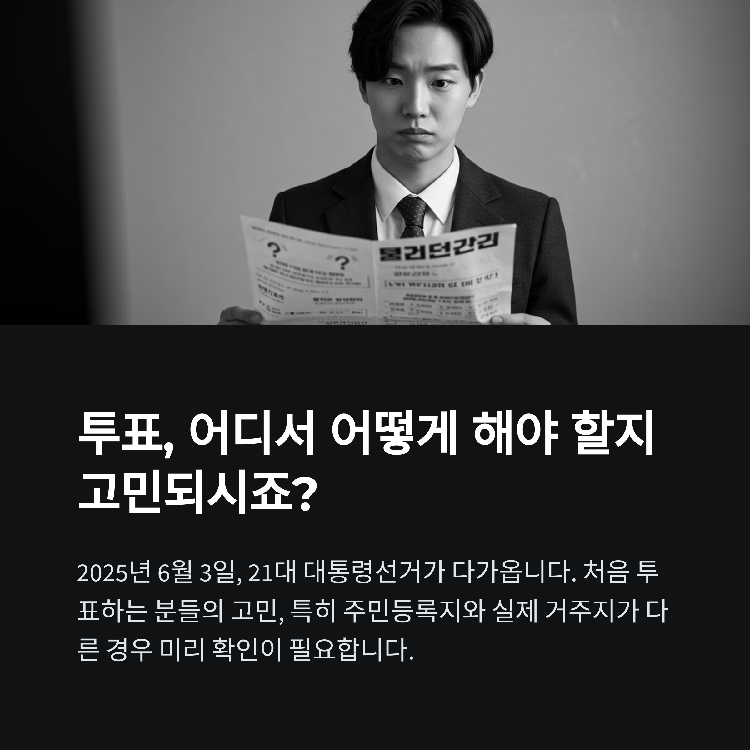 2025년 6월 3일, 21대 대통령선거 본투표일이 다가오고 있습니다. 하지만 처음 투표하는 분이라면 “내 투표소는 어디지?”, “투표 준비물은 뭘 챙겨가야 할까?”, “투표 방법이 복잡할까?” 등 궁금한 점이 많으실 거예요. 특히 주민등록지와 실제 거주지가 다른 경우, 투표할 수 있는 방법이 제한될 수 있어 미리 확인이 필요합니다[5][8][9].