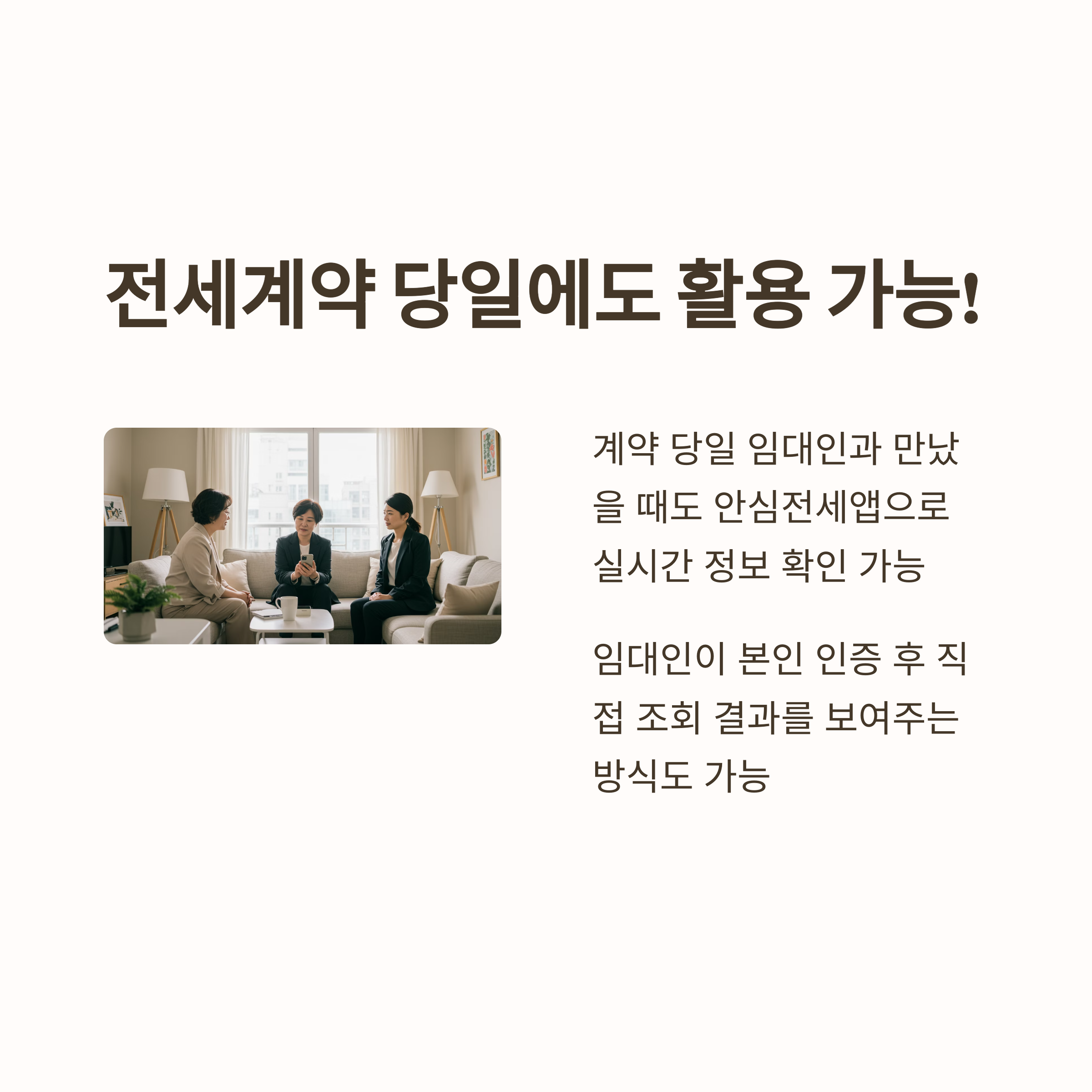 - 계약 당일 임대인을 직접 만난 경우, 안심전세앱에서 임대인 정보를 실시간 조회할 수 있습니다.
