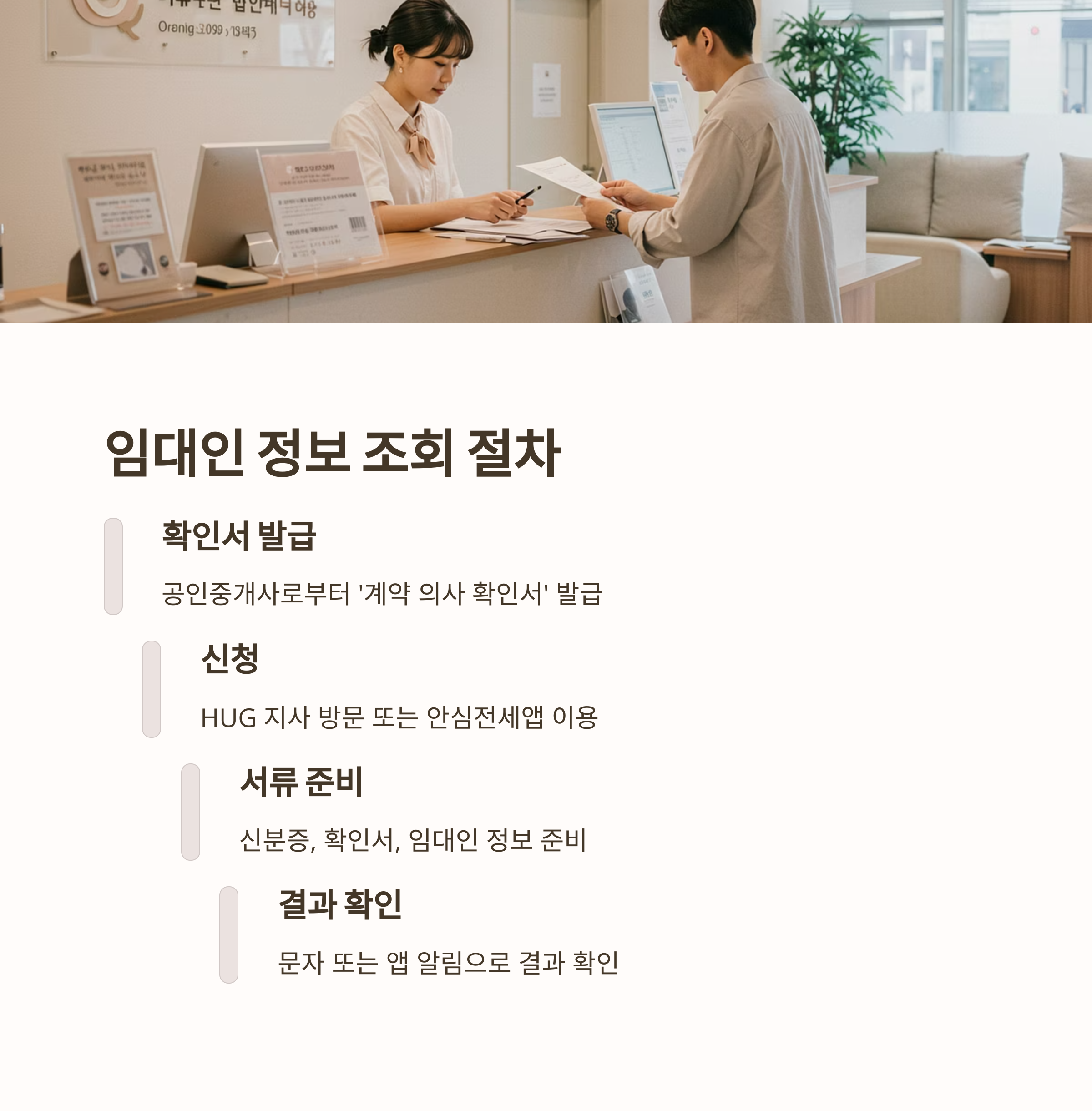 이제 임대인 정보 조회 절차와 방법을 자세히 알아보겠습니다. 먼저 공인중개사로부터 '계약 의사 확인서'를 발급받아야 합니다. 그 다음 HUG 지사에 방문하거나 안심전세앱을 이용해 신청하면 됩니다.