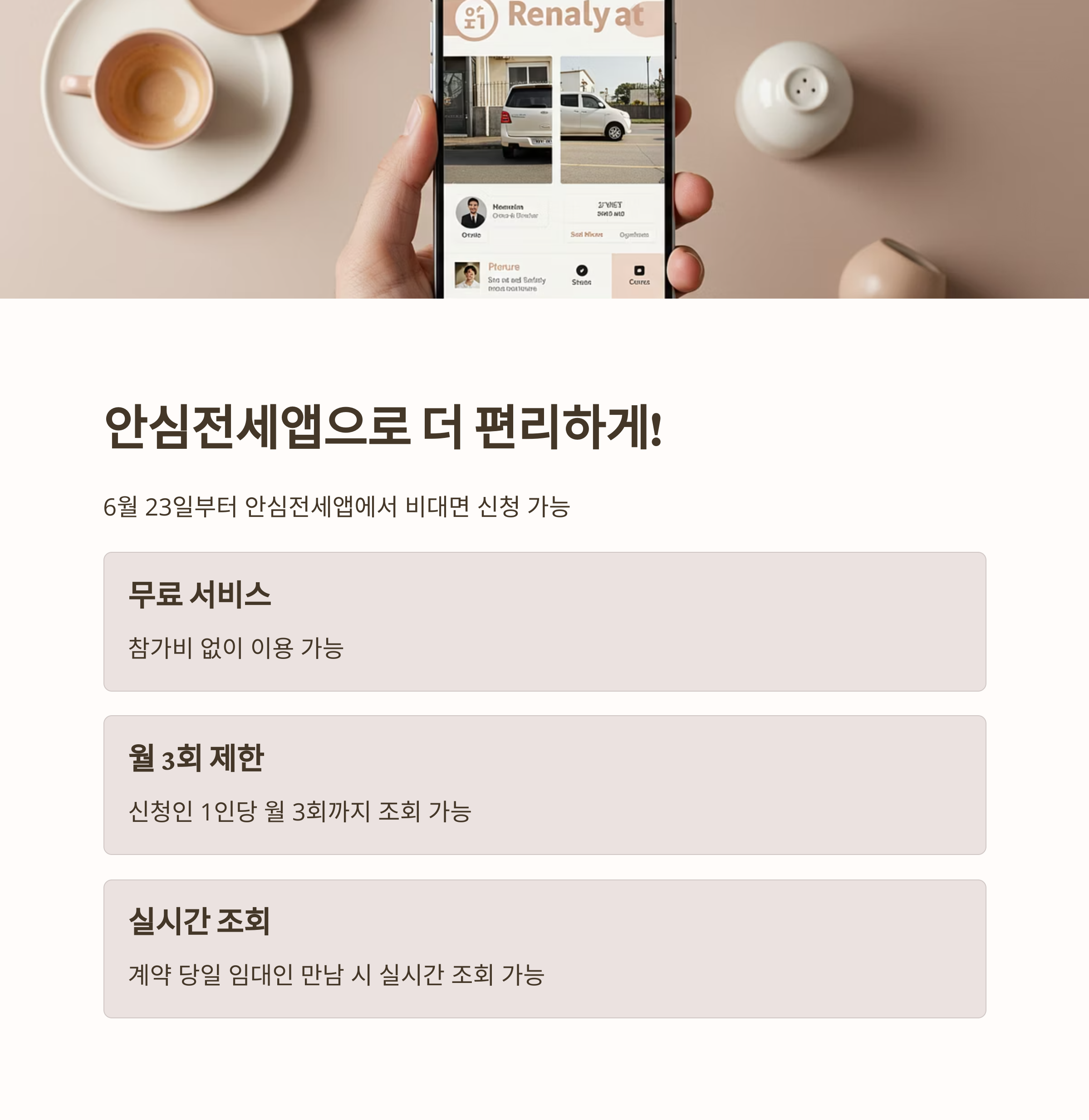 - 조회 결과 확인: 결과는 문자 또는 앱 알림으로 통보되며, 임대인에게도 정보 제공 사실이 문자로 안내됩니다.