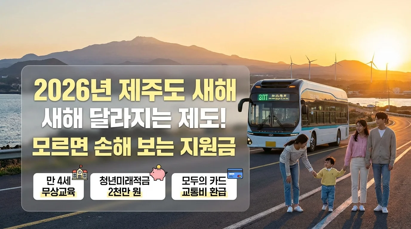 2026년 제주도는 교육, 금융, 복지 전반에 걸쳐 도민의 삶의 질을 실질적으로 높이는 대대적인 변화를 예고하고 있습니다. 특히 만 4세 무상교육 확대와 2,000만 원 목돈 마련이 가능한 청년미래적금, 그리고 교통비 환급 혜택은 가계 경제에 즉각적인 보탬이 될 핵심 정책들입니다. 본 가이드는 단순한 정보 나열을 넘어, 제주 도민이 놓치기 쉬운 세액공제 혜택과 비과세 한도까지 정밀하게 분석하여 타 콘텐츠와 차별화된 실익을 제공하고자 했습니다.