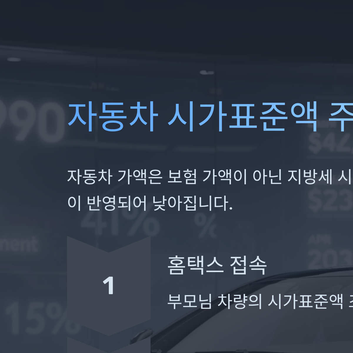 - 표에서 주목할 점: 자동차 가액은 보험 가액이 아닌 '지방세 시가표준액'을 기준으로 하며, 매년 감가상각(Depreciation)이 반영되어 낮아집니다.