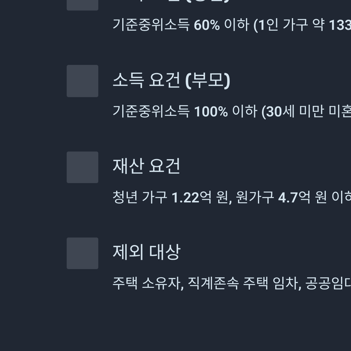 - [ ] 소득 요건(원가구/부모): 기준중위소득 100% 이하 (30세 미만 미혼 시 적용)