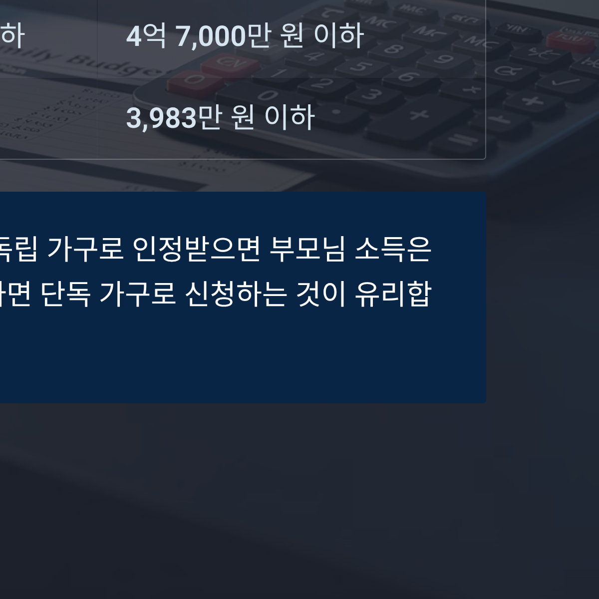 | 결론 | 본인 소득이 낮아도 부모님 재산이 많으면 제외 | 부모님과 분리 거주해도 원가구 심사 포함 | 30세 이상 등 예외 조건 확인 필수 |