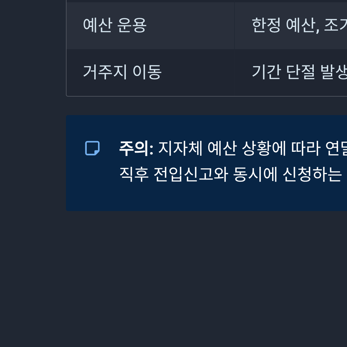 | 거주지 이동 | 재신청 시 기간 단절 발생 | 상시 접수로 공백 최소화 | 이사 후 즉시 재신청 권장 |
