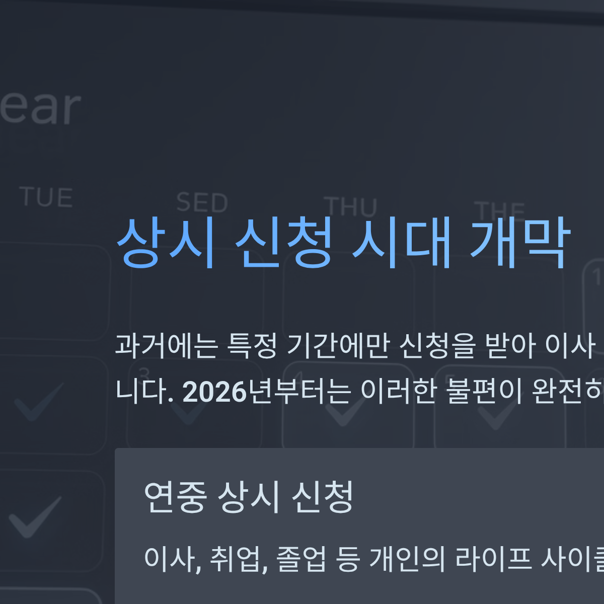 과거 청년월세지원은 특정 기간(보통 2주~한 달)에만 신청을 받아, 이사 시기가 맞지 않거나 정보를 늦게 접한 청년들이 혜택에서 소외되는 고질적인 문제가 있었습니다. 제가 상담했던 한 청년은 이사 일주일 차이로 신청 기간을 놓쳐 1년을 기다려야 했던 안타까운 사례도 있었습니다. 2026년부터는 이러한 불편을 해소하기 위해 '상시 신청제'로 전격 전환됩니다.