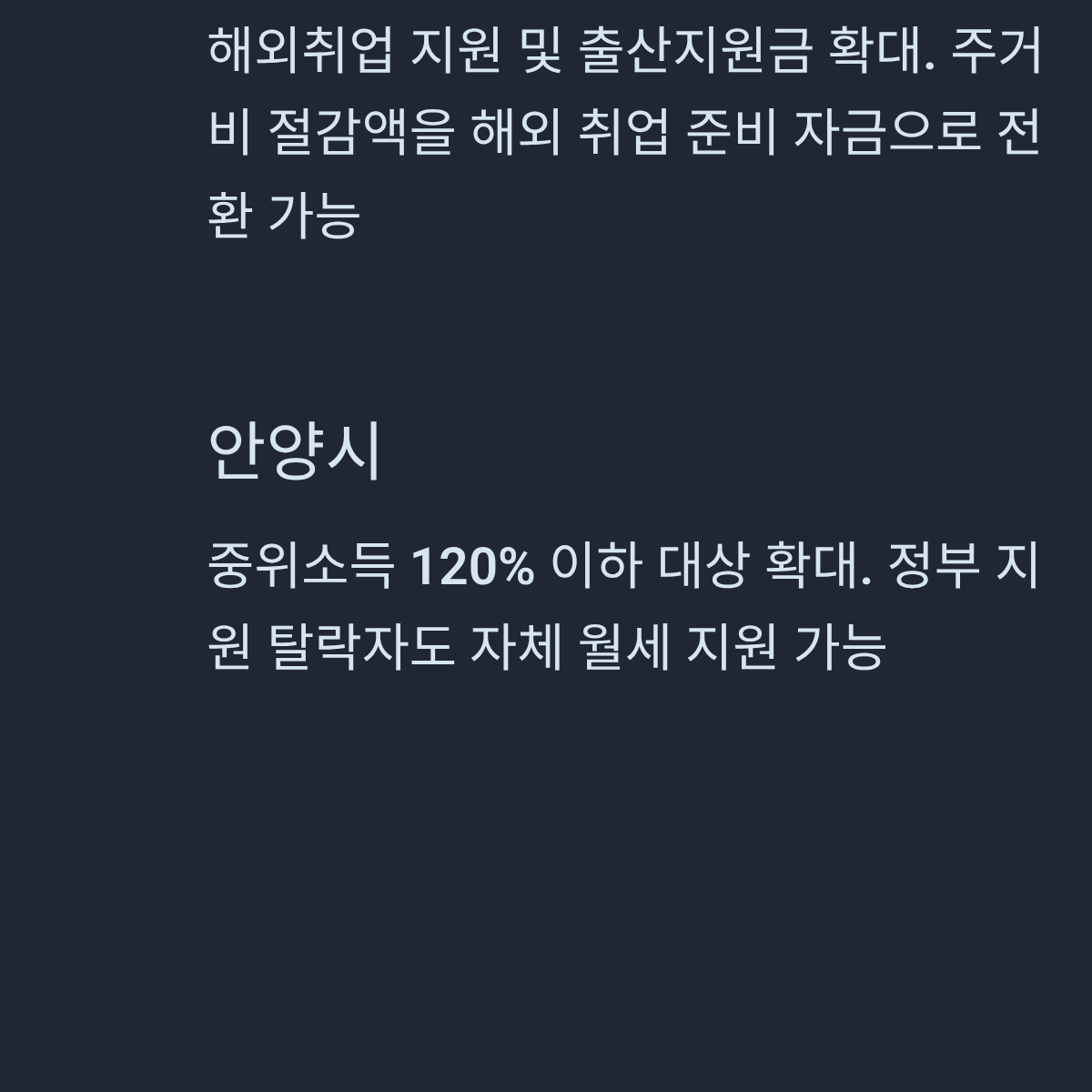 | 수원특례시 | 해외취업 지원(미국 등) 및 출산지원금 확대 | 주거비 절감액을 해외 취업 준비 자금으로 전환 가능 | 주거 안정 + 커리어 확장 |
