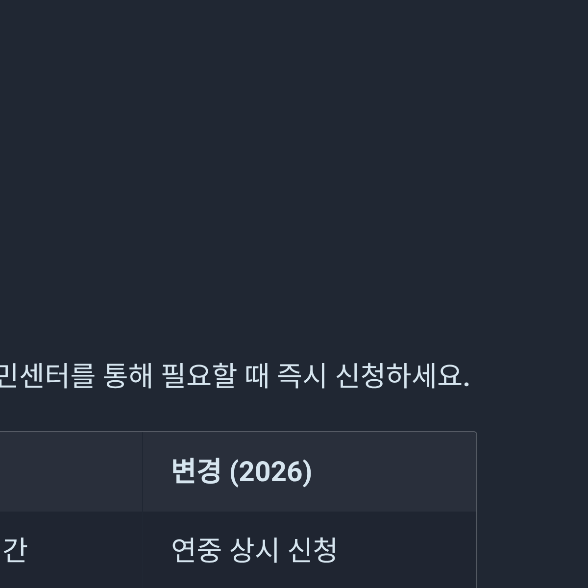 | 신청 기간 | 연 1회, 특정 기간 지정 | 연중 상시 신청 | 필요할 때 즉시 신청 가능 |