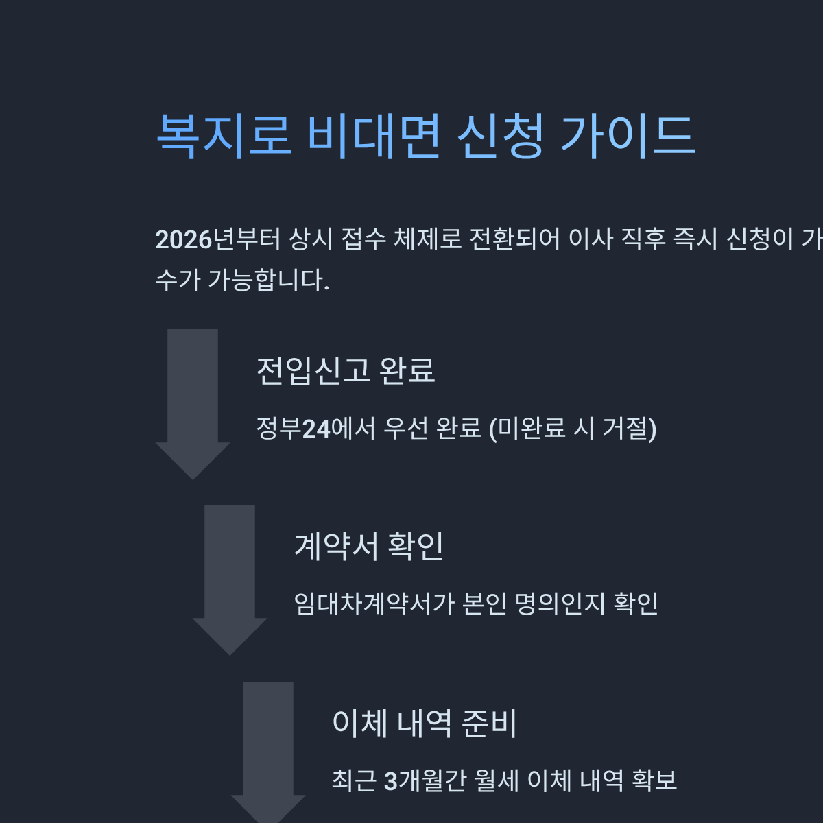 * 상시 신청으로 바뀌면서 '선착순'에 대한 압박이 줄었지만, 지자체 예산 상황에 따라 연말에는 처리가 늦어질 수 있으므로 이사 직후 전입신고와 동시에 신청하는 것이 가장 유리합니다.