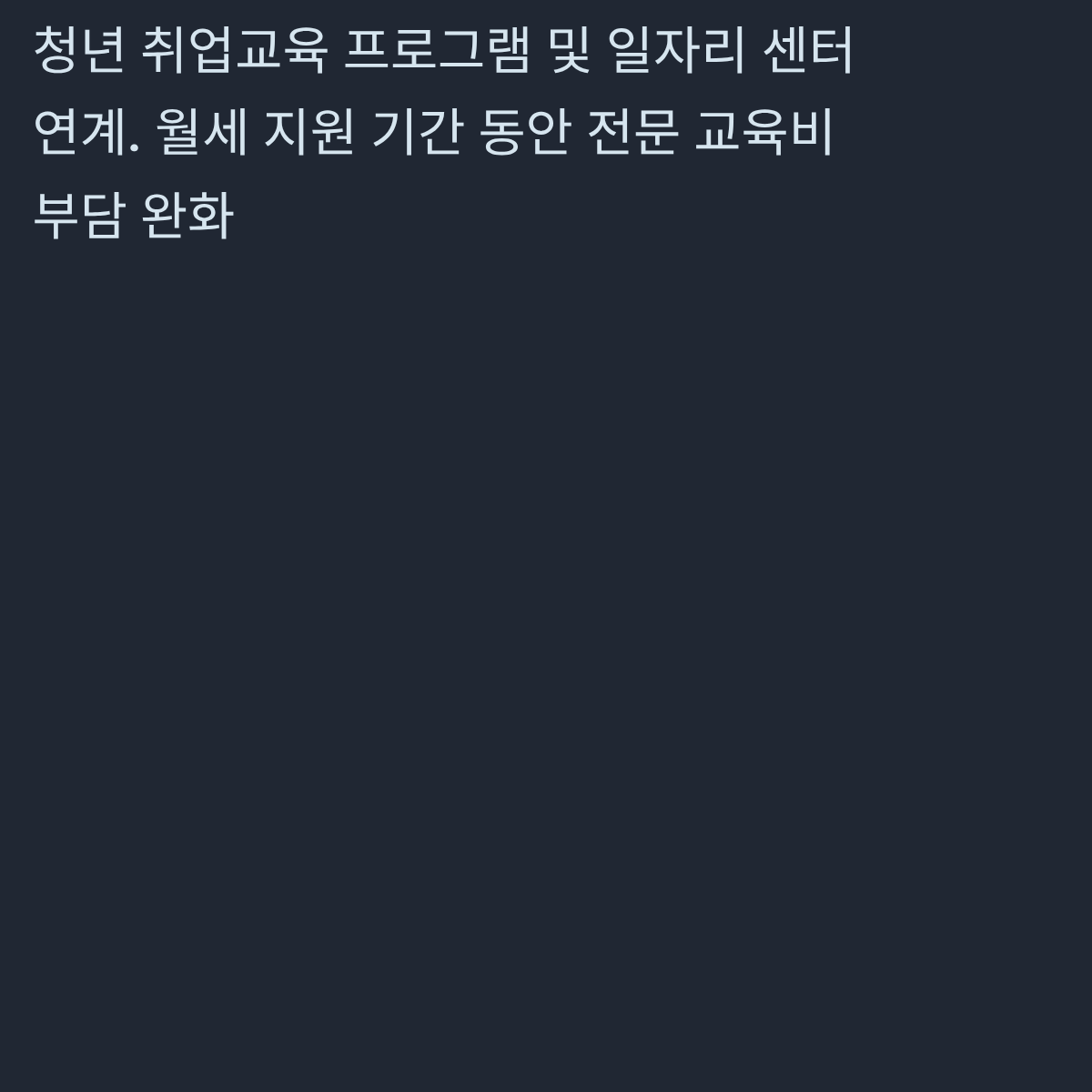 | 서울 양천구 | 청년 취업교육 프로그램 및 일자리 센터 연계 | 월세 지원 수혜 기간 동안 전문 교육비 부담 완화 | 주거 안정 + 직무 역량 강화 |