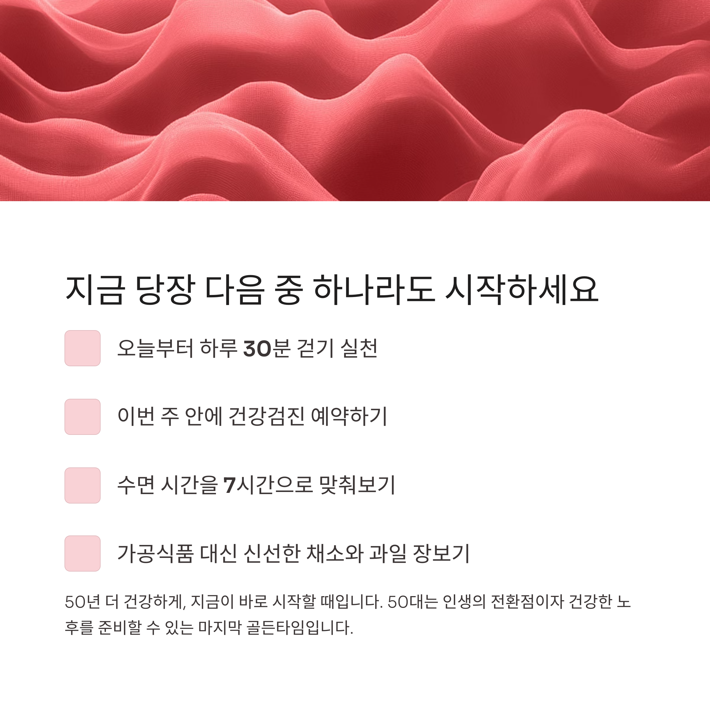 50대는 인생의 전환점입니다. 지금까지의 생활습관을 점검하고 건강한 노후를 준비할 수 있는 마지막 골든타임이기도 합니다.