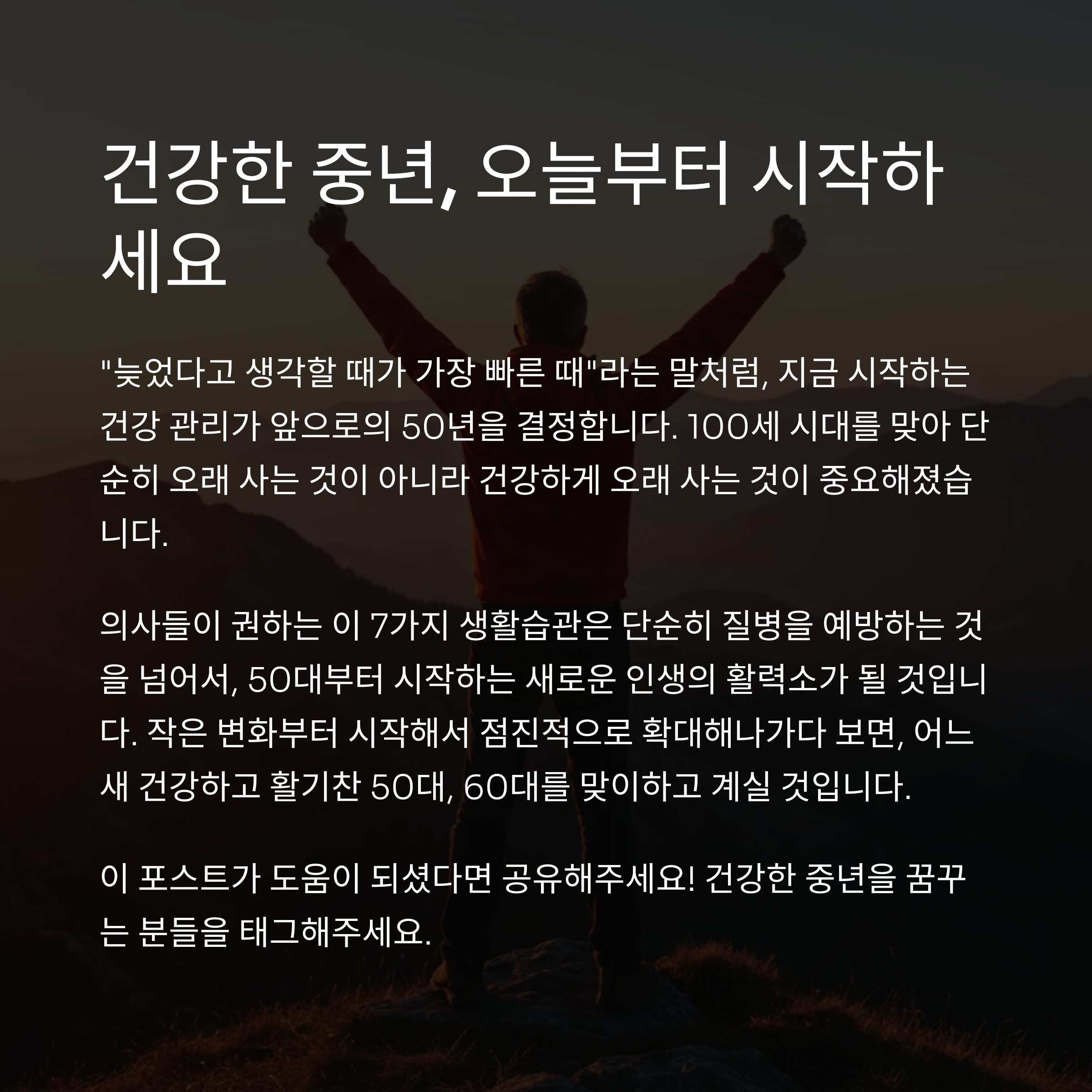 의사들이 권하는 이 7가지 생활습관은 단순히 질병을 예방하는 것을 넘어서, 50대부터 시작하는 새로운 인생의 활력소가 될 것입니다. 작은 변화부터 시작해서 점진적으로 확대해나가다 보면, 어느새 건강하고 활기찬 50대, 60대를 맞이하고 계실 것입니다.