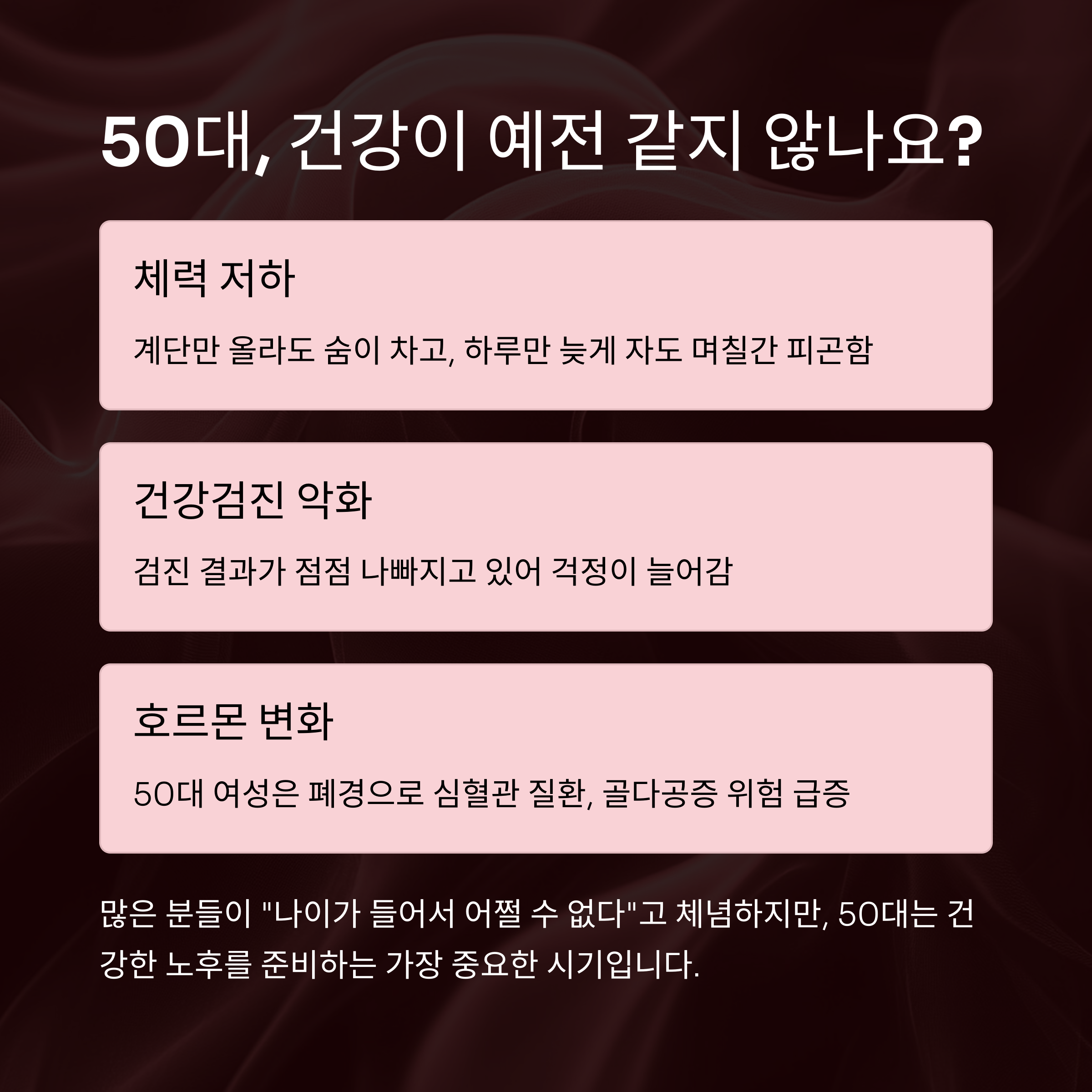 50대에 들어서면서 많은 분들이 비슷한 고민을 하십니다[. "왜 계단만 올라도 숨이 차지?", "예전에는 밤샘 근무도 거뜬했는데 이제는 하루만 늦게 자도 며칠간 피곤하네", "건강검진 결과가 점점 나빠지고 있어"와 같은 걱정들 말입니다.