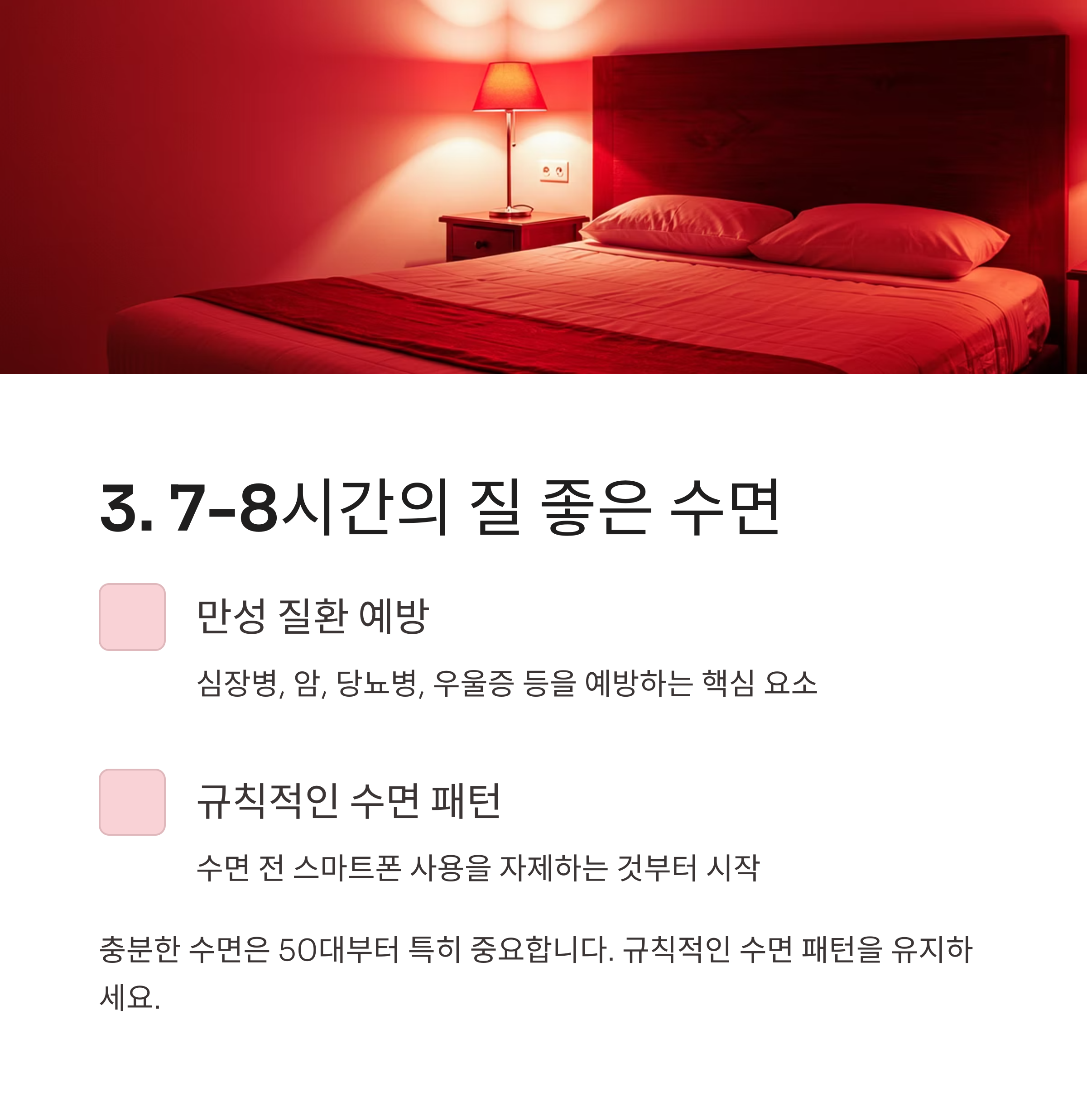 충분한 수면은 심장병, 암, 당뇨병, 우울증 등 만성 질환을 예방하는 핵심 요소입니다[5]. 50대부터는 특히 규칙적인 수면 패턴을 유지하는 것이 중요하며, 수면 전 스마트폰 사용을 자제하는 것부터 시작해보세요.