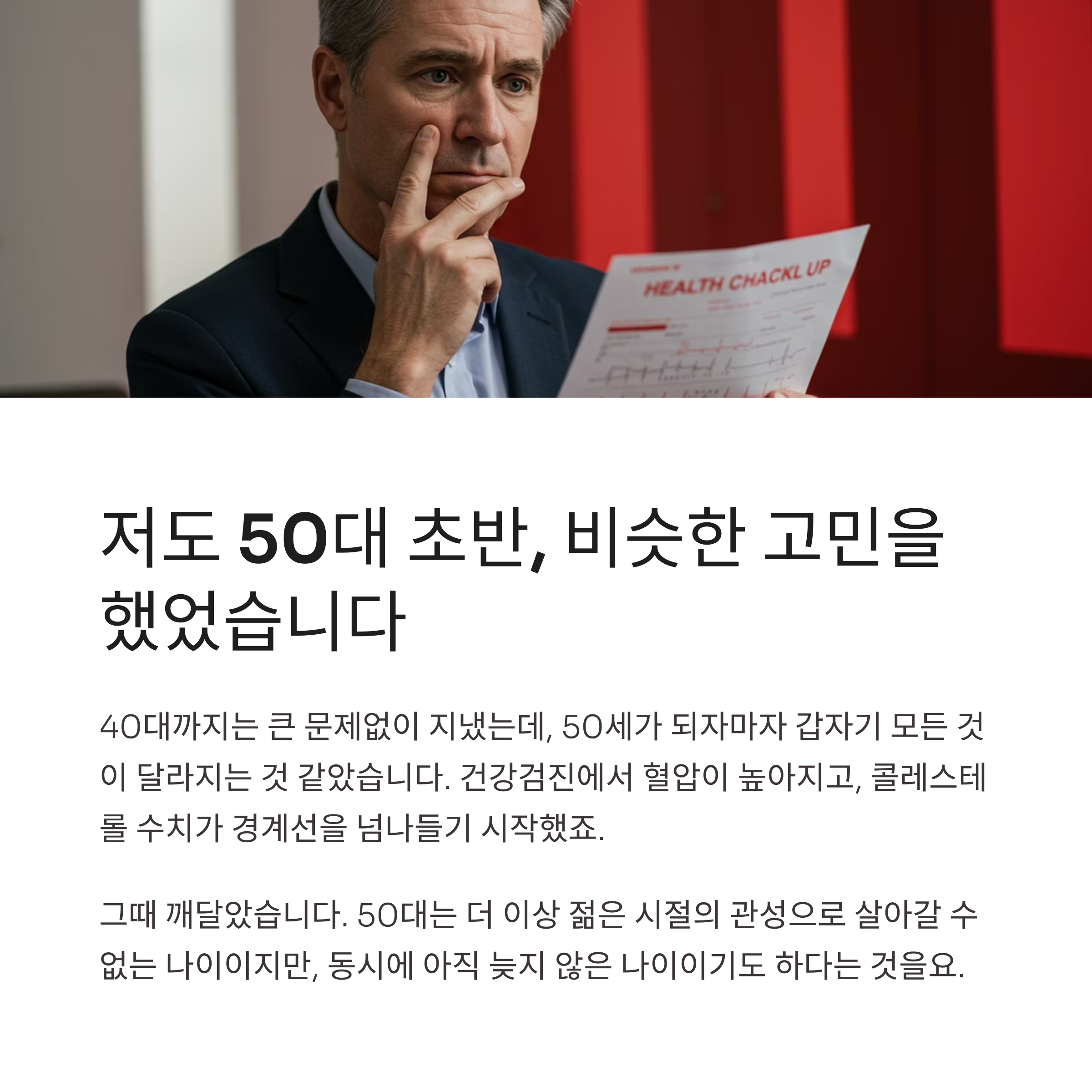 그때 깨달았습니다. 50대는 더 이상 젊은 시절의 관성으로 살아갈 수 없는 나이라는 것을. 하지만 동시에 아직 늦지 않은 나이이기도 하다는 것을요.