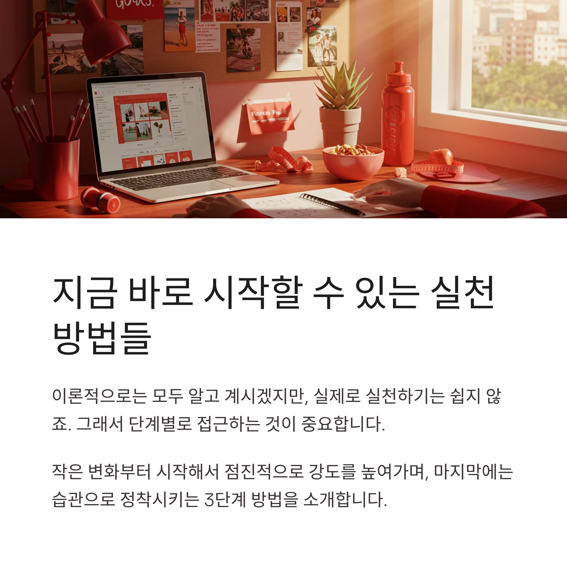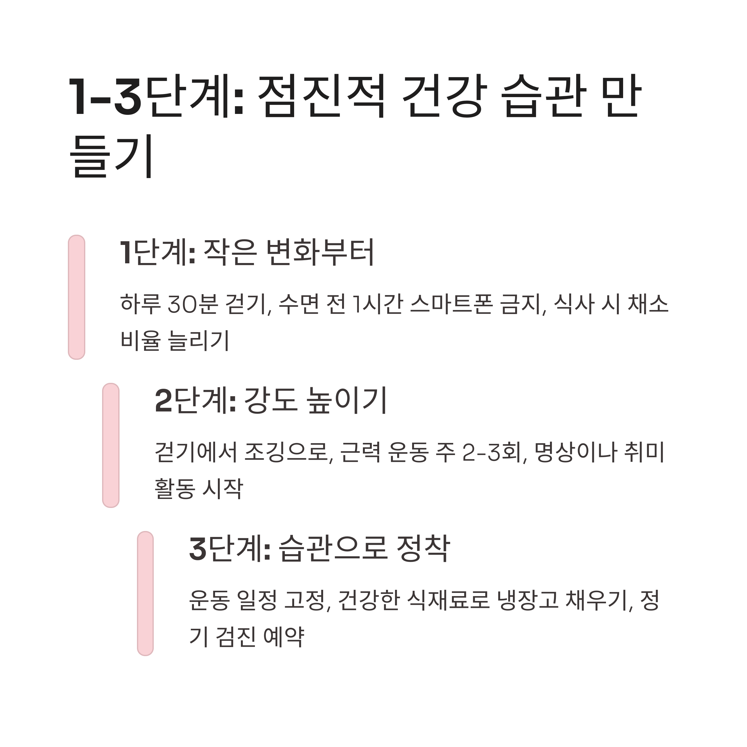 이론적으로는 모두 알고 계시겠지만, 실제로 실천하기는 쉽지 않죠. 그래서 단계별로 접근하는 것이 중요합니다.