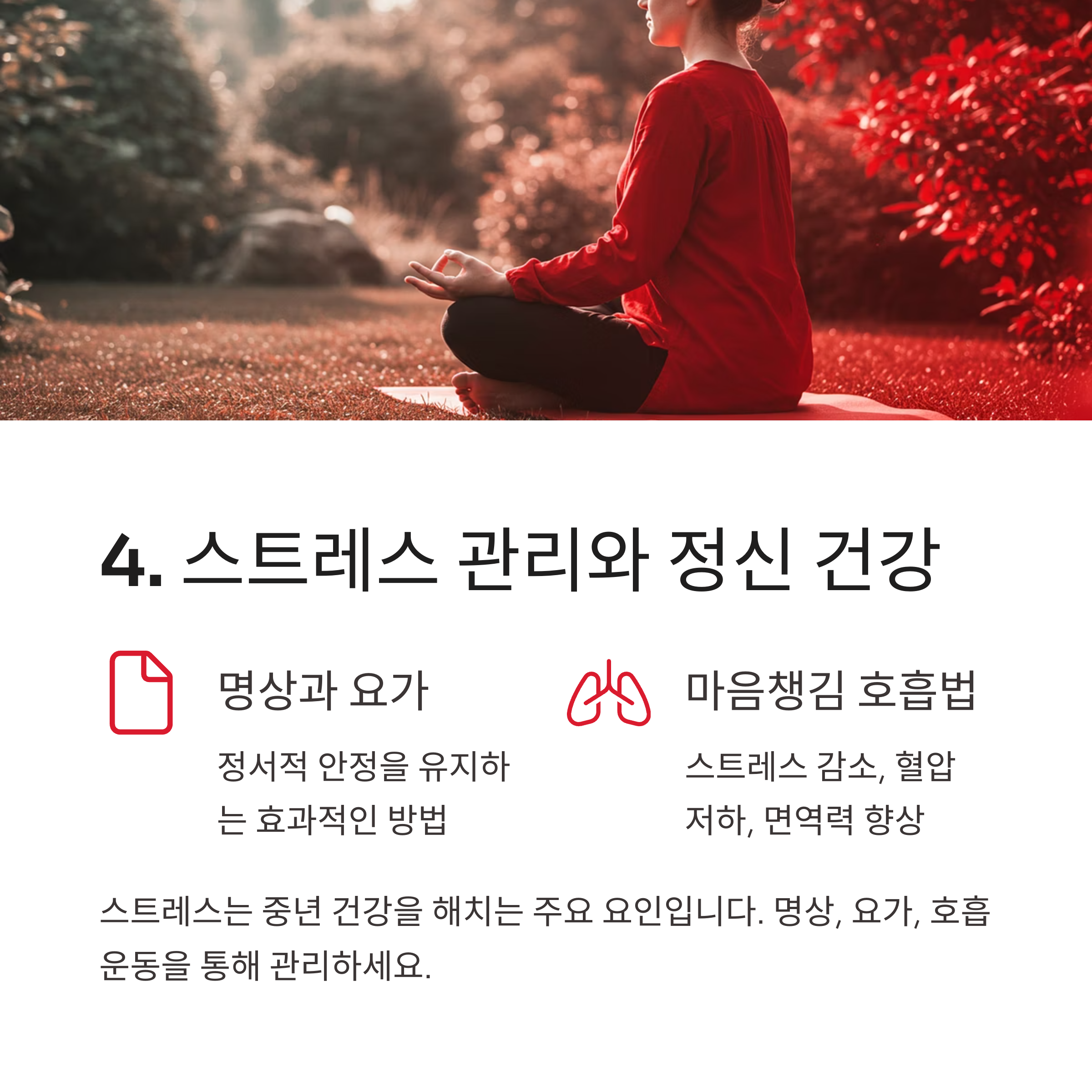 스트레스는 중년 건강을 해치는 주요 요인 중 하나입니다[13]. 명상, 요가, 호흡 운동 등을 통해 스트레스를 관리하고 정서적 안정을 유지하는 것이 중요합니다.