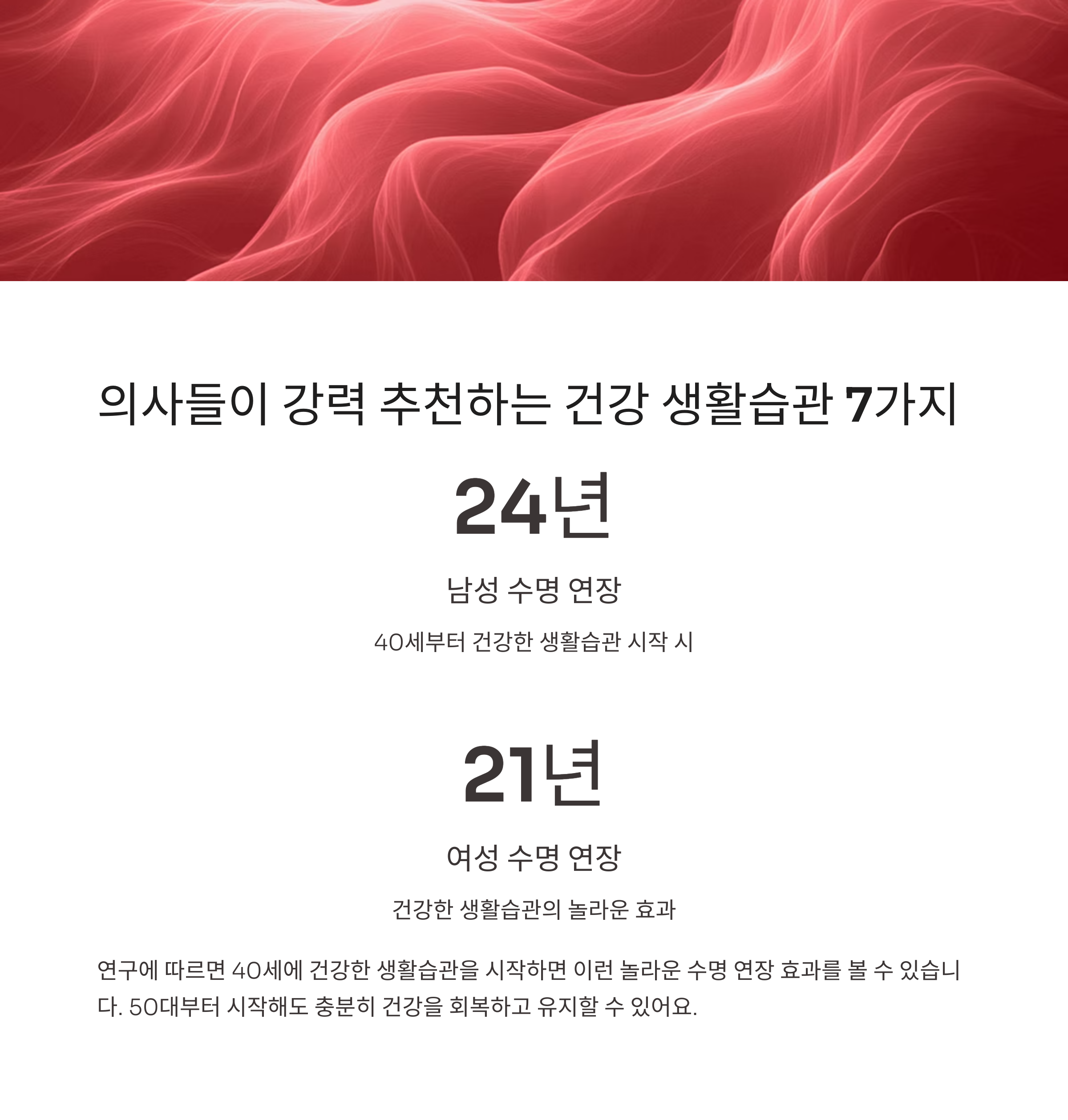 다행히 의료진들과 상담하고 여러 자료를 찾아보면서, 50대부터 시작해도 충분히 건강을 회복하고 유지할 수 있는 방법들을 발견했습니다. 연구에 따르면 40세에 건강한 생활습관을 시작하면 남성은 평균 24년, 여성은 21년의 수명 연장 효과를 볼 수 있다고 합니다.